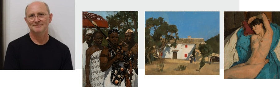 "This exhibition consists of three main parts. The Royal Tour to West Africa, studio nudes and Spanish landscapes. This might appear a diverse exhibition but I hope there is a unifying sentiment. The desire to emotionally connect with the viewer, whether its a painting of a group of fishermen on the sand or a nude confronting herself in the mirror. "