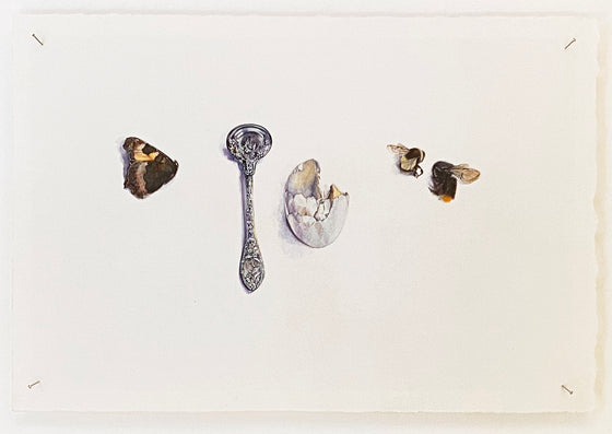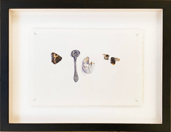 From a family of collectors, my father collected blown birds eggs in the 1940s, which I have incorporated into my works. My personal collection of beetles, butterflies and bees also frequent my compositions.