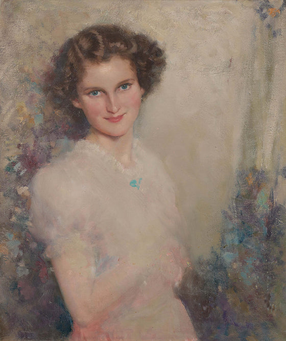 Guy Lipscombe was a graphic artist and illustrator but also a sought-after portrait painter. This looks like a rather personal work, a warm, direct gaze, that is more reminiscent of a moment caught by a snapped photograph than the hours of sitting she must have endured. Difficult to date, as in looks and costume she is deliciously timeless, but probably 1930s.