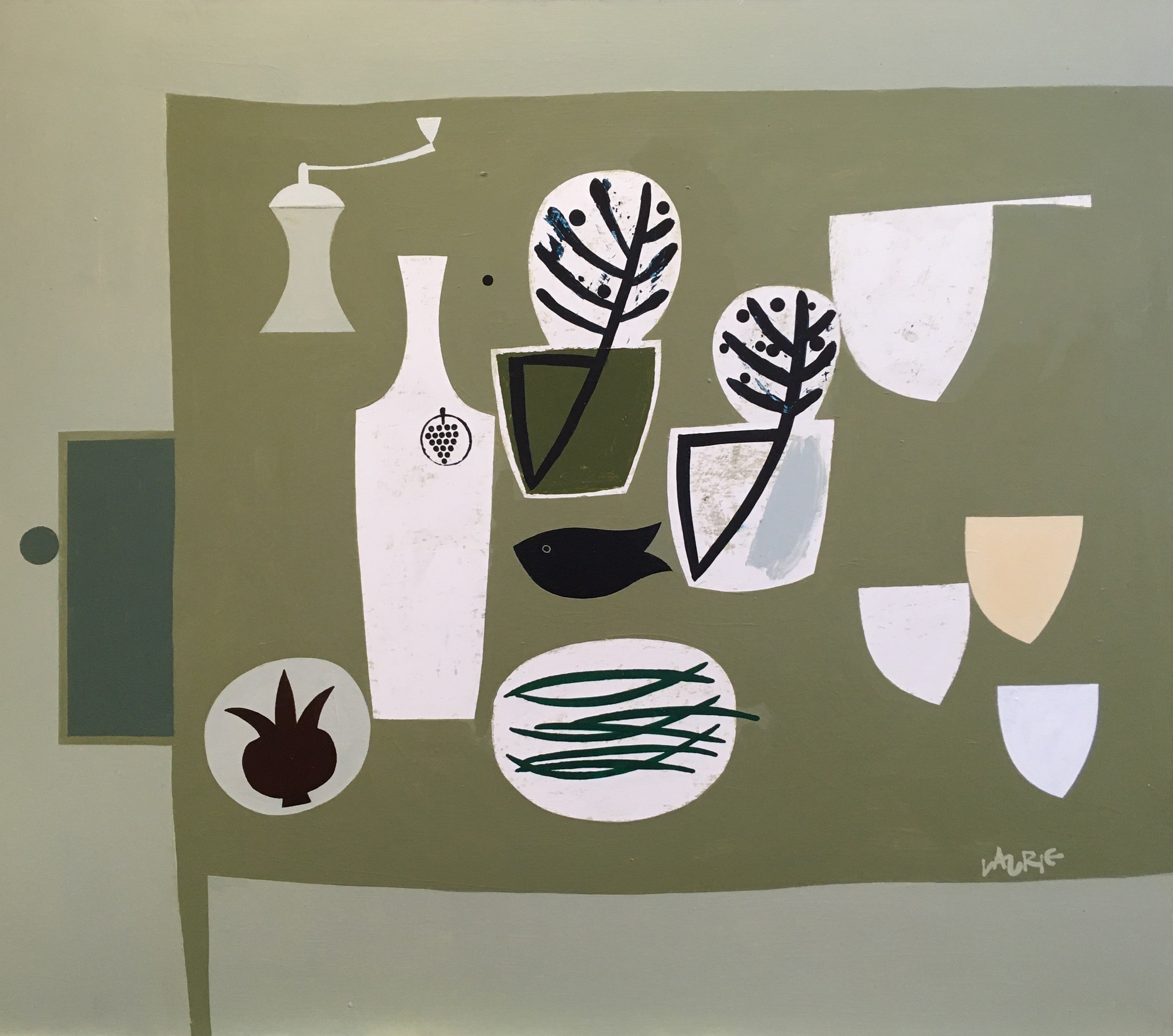 Simon’s paintings are typically inspired by everyday objects and the ever-changing Scottish landscape; they have been said to combine the purity and formalism of the St Ives School with the rich tradition of the Scottish Colourists. On first encounter they appear light hearted and joyous, both in their vibrant palette and choice of everyday items placed in jaunty juxtaposition.  As with many painters of similar stature the rich decorative quality of each work belies a greater complexity.  Simon is a very serious painter and his current approach is the culmination of several decades at his craft. Originally an abstract constructionist he produced monochromatic three-dimensional works before developing a more colourful series of found object boxed sculptures in the 1980s and 1990s. Since then he has returned to the flat surface, to paint and collage, to refine the ideas he had explored to the full in the constructions. These paintings are the culmination of that distillation process, the reduction of reality to simple form and colour.
