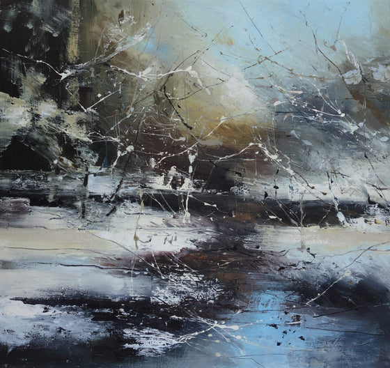 Claire’s oil and mixed media canvases combine layers of paint with fragments of collage. She scratches through sections of the painting to allow colours from underneath to emerge. “I want to create evocative paintings of land and sea that show a sense of place; different weather conditions are key elements”. Claire uses brushes and different size palette knives to build up layers and create depth. Paint is also flicked or carefully thrown on selected areas, evidence of this can be found all over her studio floor!  . Claire's work has ambiguous elements as she believes that “total recognition inhibits the imagination” however, at the same time, she works with strong structural compositions more often than not using a square format which she feels is important in creating a balance and harmony in her paintings.  Inspiration comes from the outdoors, walking and travelling, and poems often accompany Claire's work to help communicate specific ideas.