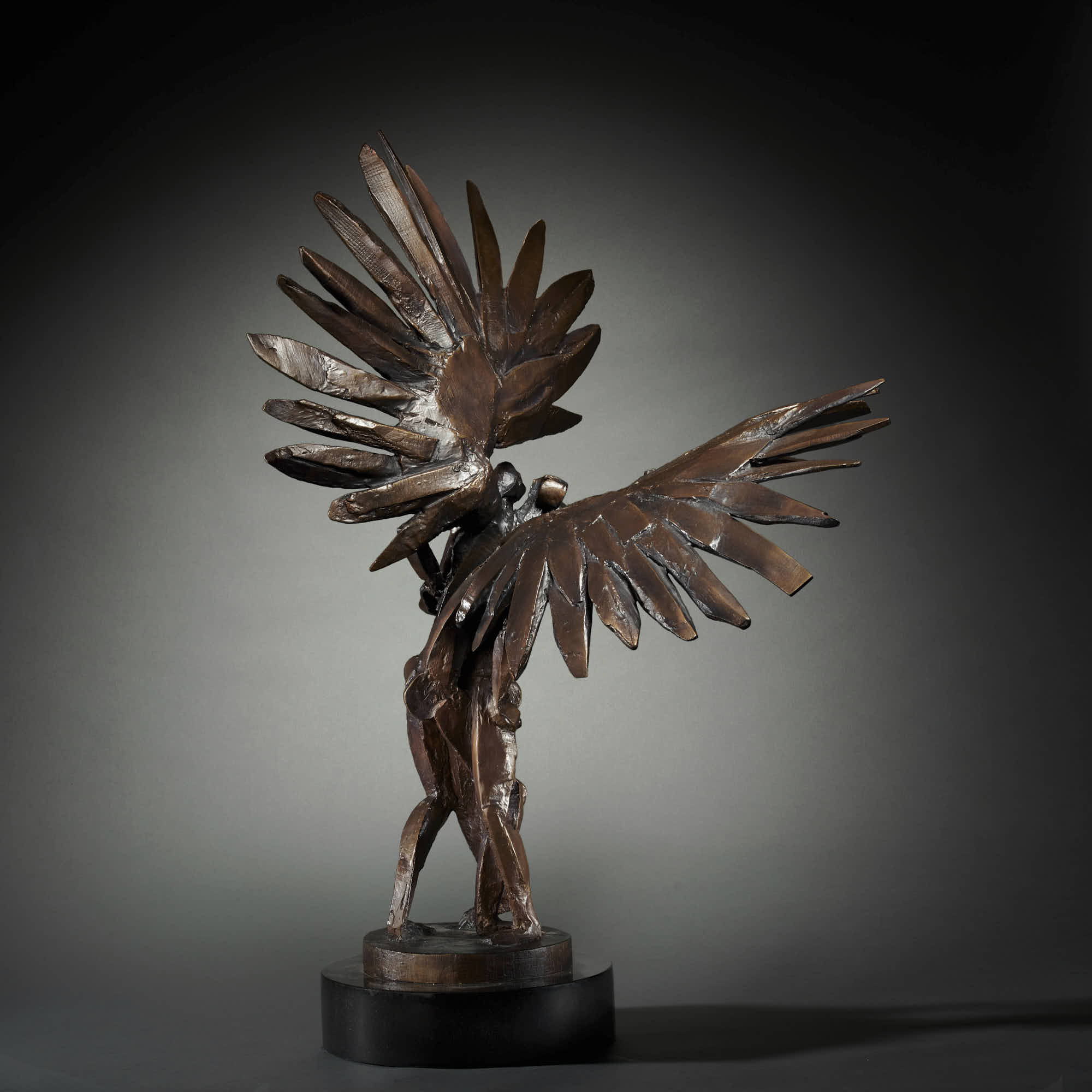 Armed with a degree in the history of art from the Courtauld Institute, Sophie set out to learn the practicalities of making figurative sculpture, attending the Sir John Cass School of Art, and also the department of anatomy at University College, London.  Her distinctive style comes from her technique of building figures from abstract geometric shapes of curved wood and attaching them to an armature to create fluid, muscular form.