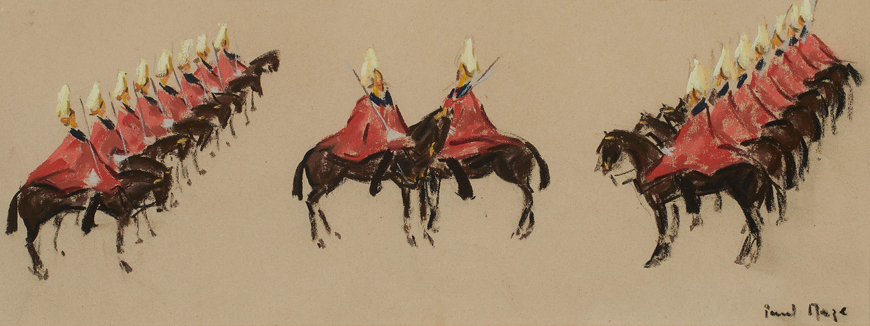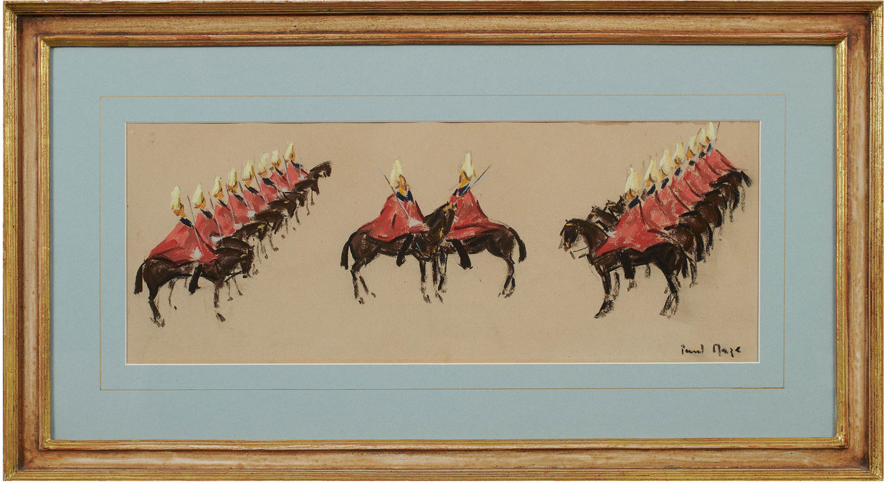 As a highly decorated soldier in the Great War, Maze new the military arena intimately. In the Second War he commanded a battalion of the Home Guard interrupted by a spell on the continent on a yearlong special mission for Sir Arthur 'Bomber' Harris at SHAEF. He enjoyed the visual feast that a splendid martial and state occasion afforded an artist. His many contacts in the military establishment, including Sir Winston Churchill, who he'd first encountered in the trenches, allowed him privileged access to the annual Trooping the Colour ceremonies and he was often to be seen, a lone figure at an easel at Horse Guards or Windsor Great Park recording each event for posterity. Indeed for major state occasions, coronations and the like, the army erected a special wooden stand granting a unique perspective above the throng. Wildenstein's held a show of his work depicting military pageantry in 1973 entitled 'Paul Maze and the Guards'. After his death a memorial service at the Royal Hospital, Chelsea was organised for him by his friend General Sir Michael Gow.