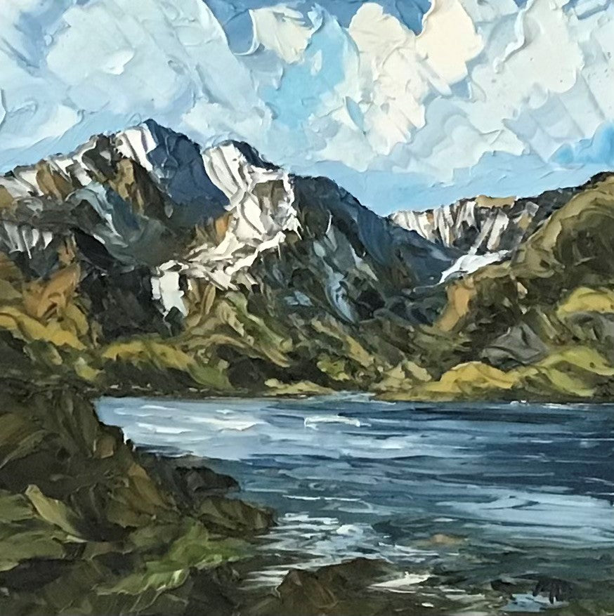 Martin is making a name for himself on the contemporary Welsh art market and we are delighted to be introducing his stunning work to our collectors east of the border. His paintings are steeped in the traditions of his antecedents in the twentieth century Welsh Art school, particularly Gwilym Prichard, Charles Wyatt Warren and of course Sir Kyffin Williams. His richly textured oils in a subtle, muted palette beautifully capture the distinctive atmosphere of North Wales whether depicting the drama of Snowdonia or the Irish Sea breaking against the shores of Anglesey.
