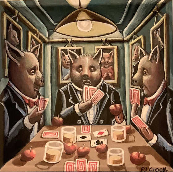 PJ’s paintings combine a highly distinctive style with extraordinary technical mastery. Rather than painting from photographs or direct observation, PJ prefers to draw from a combination of remembered observation and imagination, resulting in an intuitive and resolved composition. Few contemporary artists are more accomplished at depicting perspective or depth of field, and the viewer has a sense of being invited into each painting, encouraged by the inclusion of the frame in the picture surface.