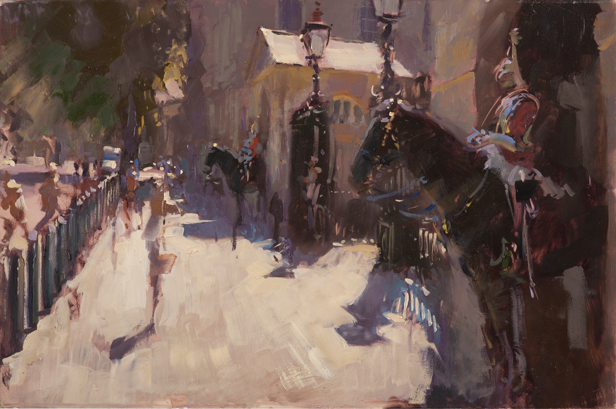 Based in South Cheshire, Rob travels widely in search of inspiration and can often be spotted painting in the streets of our major cities. His commissions have taken him all over the world; a residency with Manchester Airport saw him outside Beijing painting on the Great Wall of China. His reputation for capturing live formal occasions was key to his residency with the Household Cavalry Mounted Regiment, but has also led him to record the Royal Gala Dinner to celebrate the conservation of the Painted Hall at the Old Royal Naval College, Greenwich. HRH The Prince of Wales unveiled a 24 foot oil painting by Rob in the Council Chamber, Stoke-on-Trent, commissioned to commemorate 100 years of the federation of the six towns.