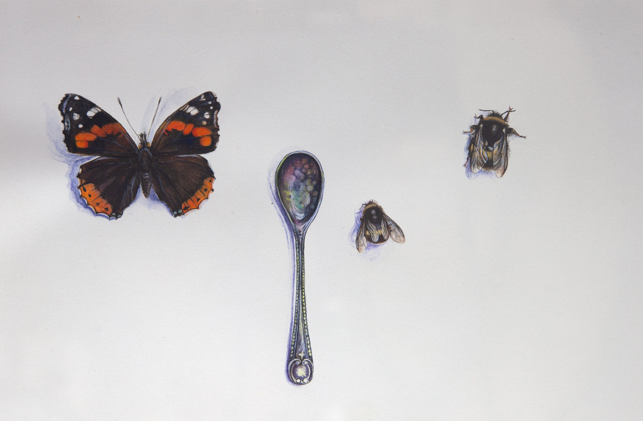"One of the earliest influences of my work whilst growing up was that of Lake District artist and children’s author Beatrix Potter, whose botanical and entomological illustrations influenced my choice of observational drawings in my early teens. After poring over Beatrix Potter’s funguses, plants, dead mammals and birds, I then began to delve further into botanical and entomological studies.
