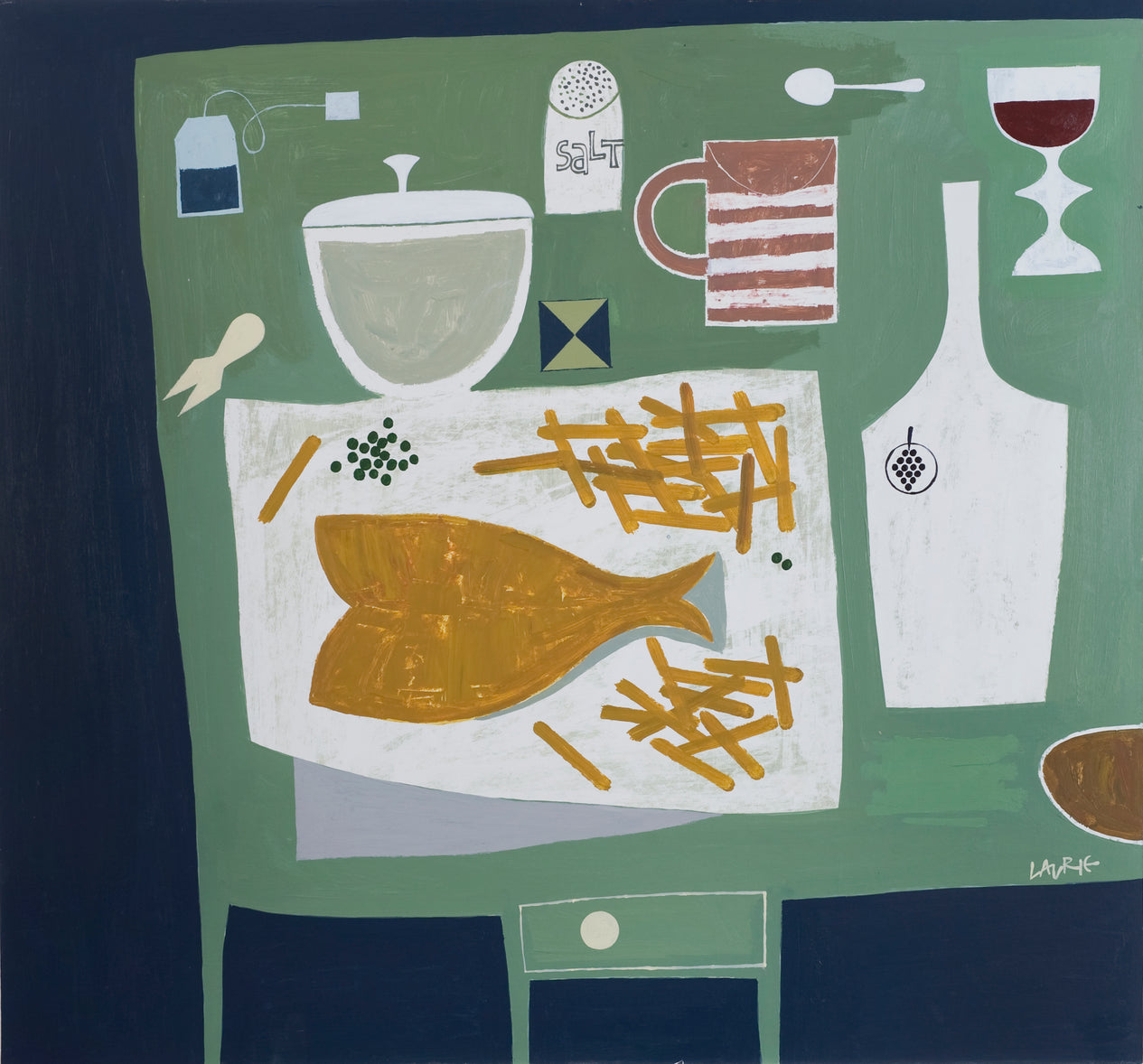 Simon’s paintings are typically inspired by everyday objects and the ever-changing Scottish landscape; they have been said to combine the purity and formalism of the St Ives School with the rich tradition of the Scottish Colourists. On first encounter they appear light hearted and joyous, both in their vibrant palette and choice of everyday items placed in jaunty juxtaposition.  As with many painters of similar stature the rich decorative quality of each work belies a greater complexity.  Simon is a very serious painter and his current approach is the culmination of several decades at his craft. Originally an abstract constructionist he produced monochromatic three-dimensional works before developing a more colourful series of found object boxed sculptures in the 1980s and 1990s. Since then he has returned to the flat surface, to paint and collage, to refine the ideas he had explored to the full in the constructions. These paintings are the culmination of that distillation process, the reduction of reality to simple form and colour.