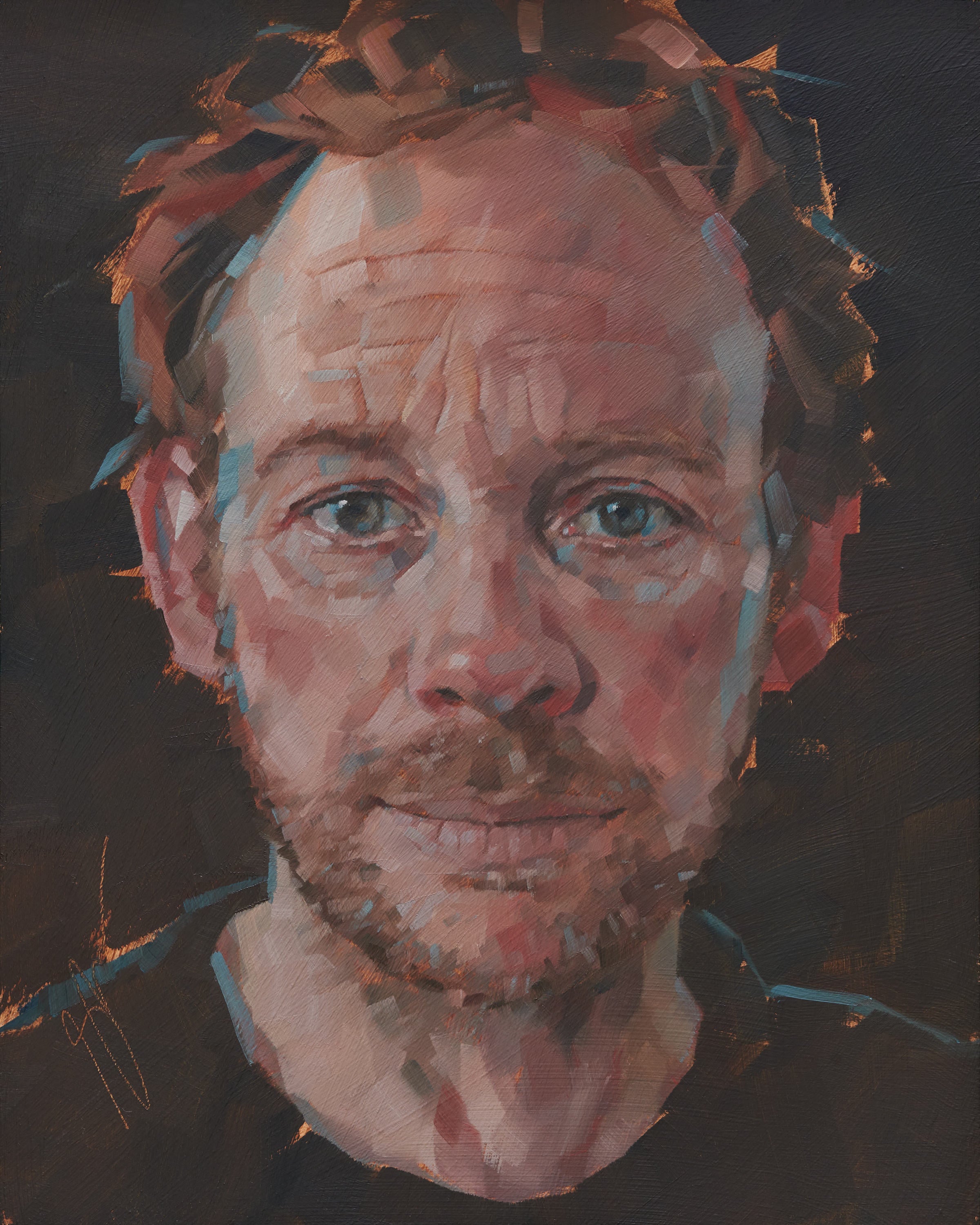 He paints using oils and mainly square brushes, working from the photographs that he takes of his sitters.  In 2008, he was runner up in the BP Portrait award and that same year was elected as a member of the Royal Society of Portrait painters (RP). He was their Vice-President from 2014 to 2021.