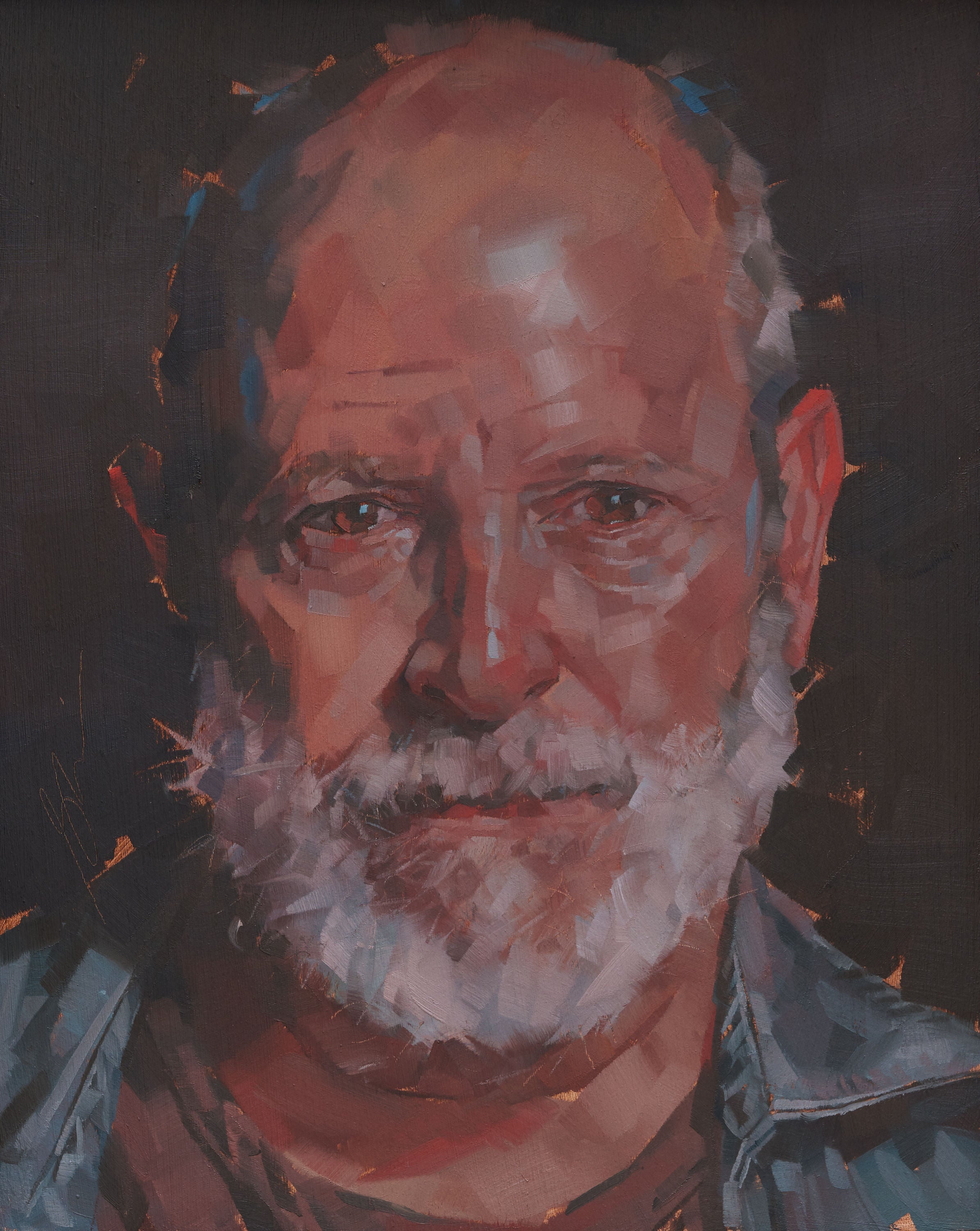 He paints using oils and mainly square brushes, working from the photographs that he takes of his sitters.  In 2008, he was runner up in the BP Portrait award and that same year was elected as a member of the Royal Society of Portrait painters (RP). He was their Vice-President from 2014 to 2021.