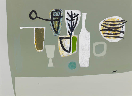 Simon’s paintings are typically inspired by everyday objects and the ever-changing Scottish landscape; they have been said to combine the purity and formalism of the St Ives School with the rich tradition of the Scottish Colourists. On first encounter they appear light hearted and joyous, both in their vibrant palette and choice of everyday items placed in jaunty juxtaposition.  As with many painters of similar stature the rich decorative quality of each work belies a greater complexity.  Simon is a very serious painter and his current approach is the culmination of several decades at his craft. Originally an abstract constructionist he produced monochromatic three-dimensional works before developing a more colourful series of found object boxed sculptures in the 1980s and 1990s. Since then he has returned to the flat surface, to paint and collage, to refine the ideas he had explored to the full in the constructions. These paintings are the culmination of that distillation process, the reduction of reality to simple form and colour.
