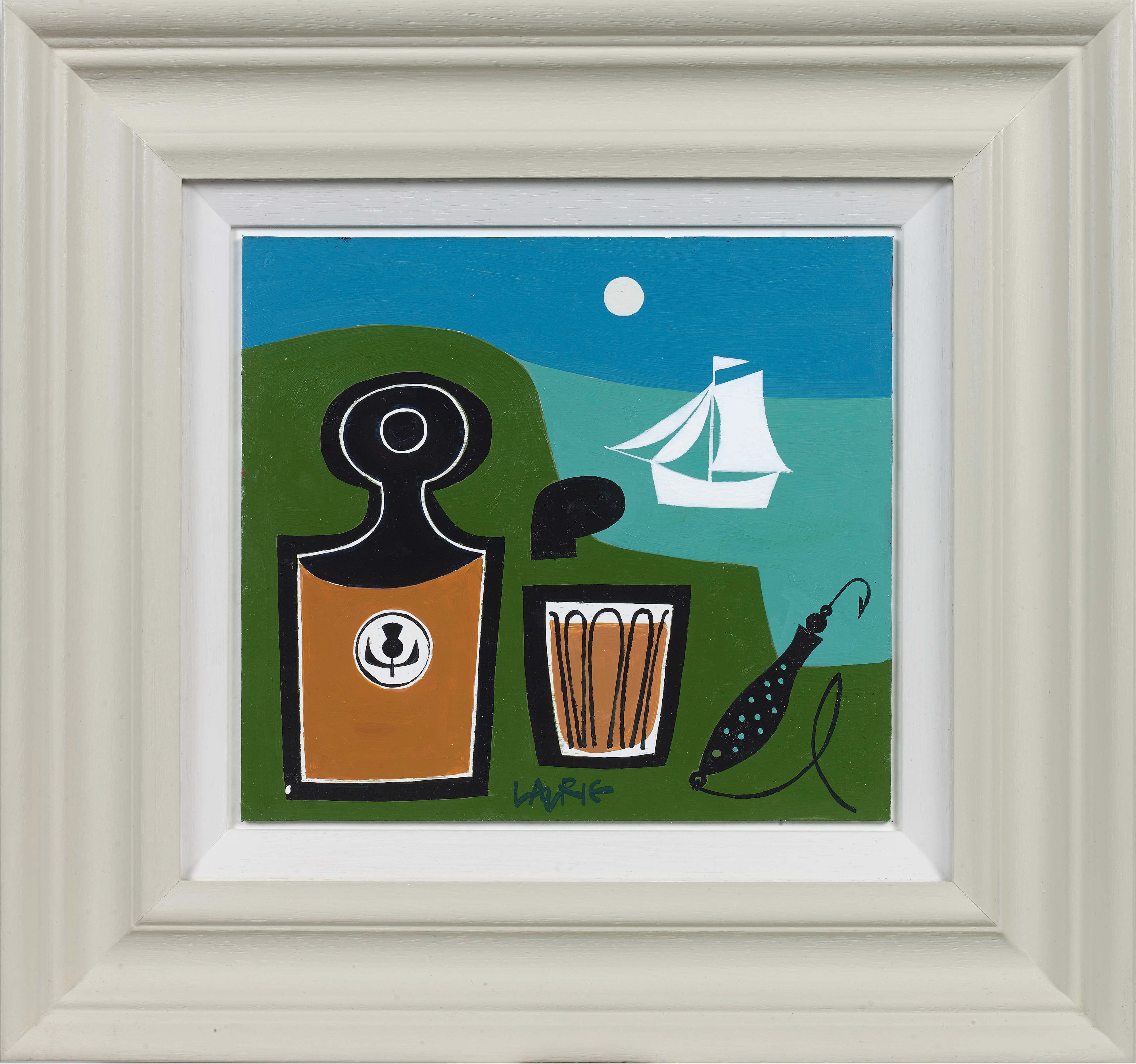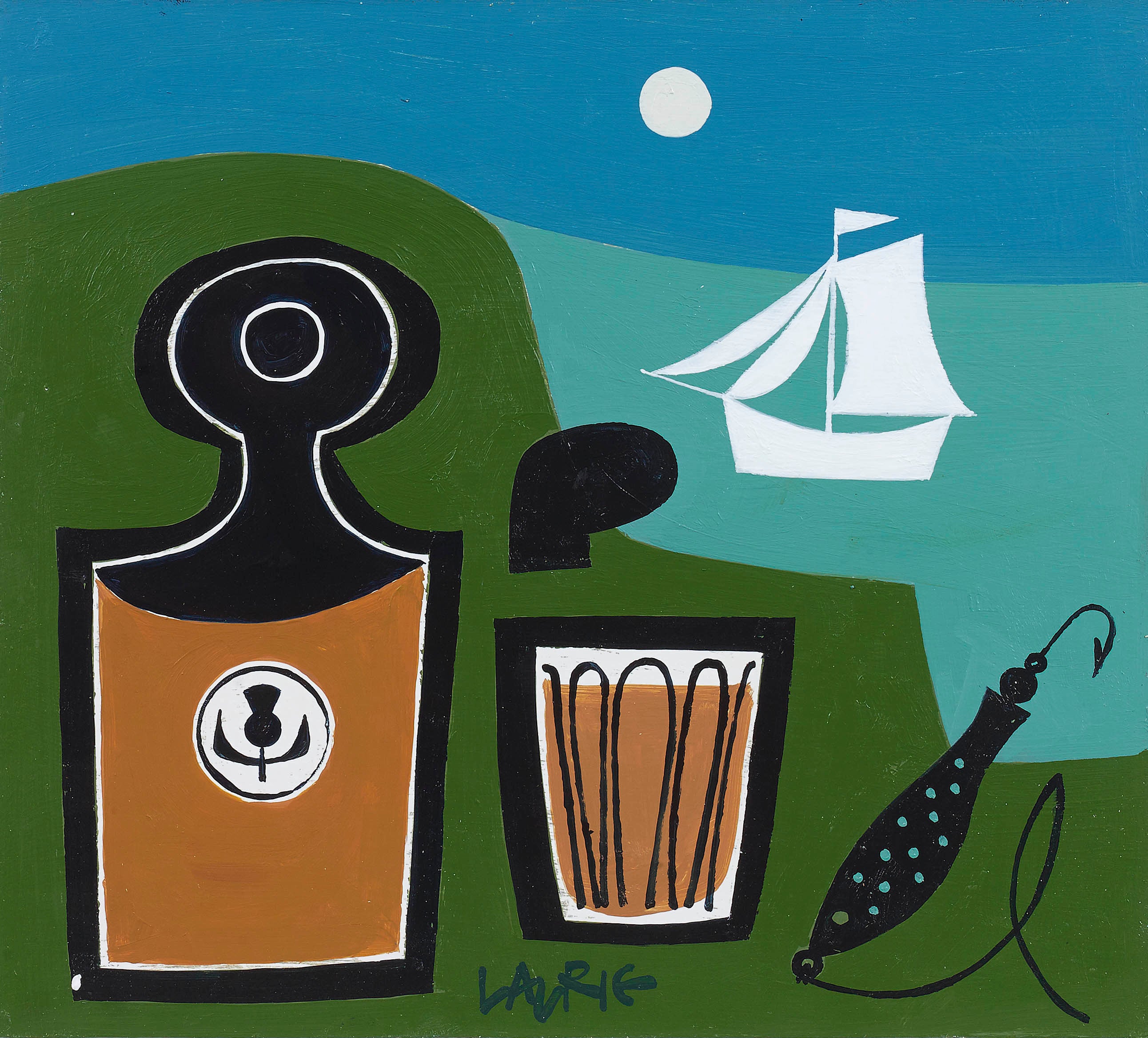 Simon’s paintings are typically inspired by everyday objects and the ever-changing Scottish landscape; they have been said to combine the purity and formalism of the St Ives School with the rich tradition of the Scottish Colourists. On first encounter they appear light hearted and joyous, both in their vibrant palette and choice of everyday items placed in jaunty juxtaposition.  As with many painters of similar stature the rich decorative quality of each work belies a greater complexity.  Simon is a very serious painter and his current approach is the culmination of several decades at his craft. Originally an abstract constructionist he produced monochromatic three-dimensional works before developing a more colourful series of found object boxed sculptures in the 1980s and 1990s. Since then he has returned to the flat surface, to paint and collage, to refine the ideas he had explored to the full in the constructions. These paintings are the culmination of that distillation process, the reduction of reality to simple form and colour.