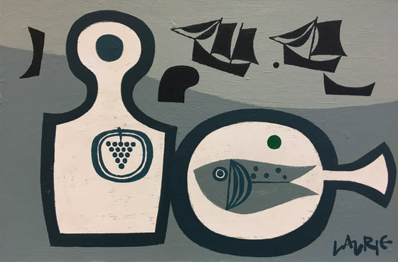 Simon’s paintings are typically inspired by everyday objects and the ever-changing Scottish landscape; they have been said to combine the purity and formalism of the St Ives School with the rich tradition of the Scottish Colourists. On first encounter they appear light hearted and joyous, both in their vibrant palette and choice of everyday items placed in jaunty juxtaposition.  As with many painters of similar stature the rich decorative quality of each work belies a greater complexity.  Simon is a very serious painter and his current approach is the culmination of several decades at his craft. Originally an abstract constructionist he produced monochromatic three-dimensional works before developing a more colourful series of found object boxed sculptures in the 1980s and 1990s. Since then he has returned to the flat surface, to paint and collage, to refine the ideas he had explored to the full in the constructions. These paintings are the culmination of that distillation process, the reduction of reality to simple form and colour.