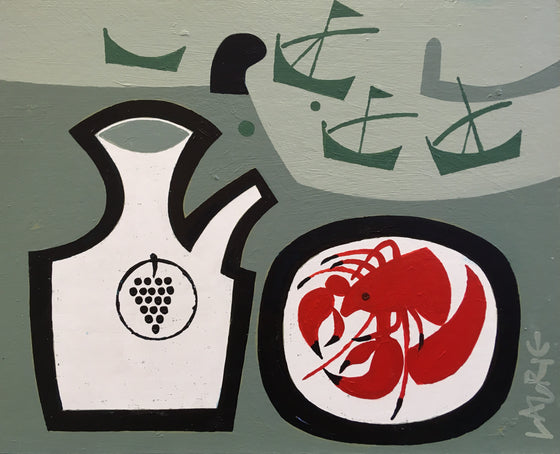 Simon’s paintings are typically inspired by everyday objects and the ever-changing Scottish landscape; they have been said to combine the purity and formalism of the St Ives School with the rich tradition of the Scottish Colourists. On first encounter they appear light hearted and joyous, both in their vibrant palette and choice of everyday items placed in jaunty juxtaposition.  As with many painters of similar stature the rich decorative quality of each work belies a greater complexity.  Simon is a very serious painter and his current approach is the culmination of several decades at his craft. Originally an abstract constructionist he produced monochromatic three-dimensional works before developing a more colourful series of found object boxed sculptures in the 1980s and 1990s. Since then he has returned to the flat surface, to paint and collage, to refine the ideas he had explored to the full in the constructions. These paintings are the culmination of that distillation process, the reduction of reality to simple form and colour.