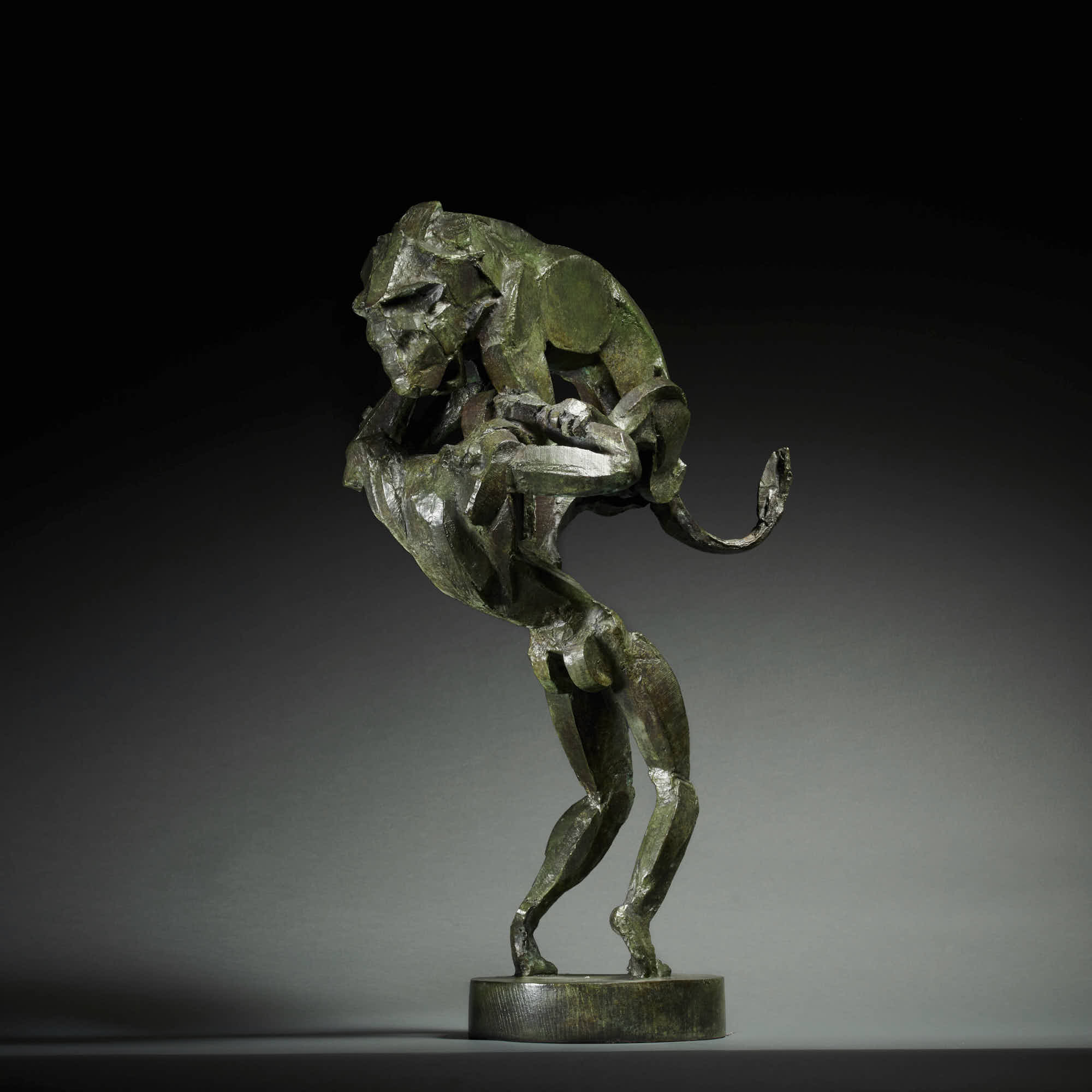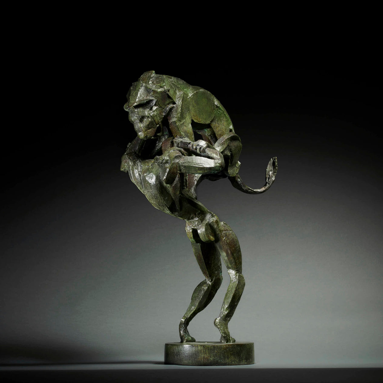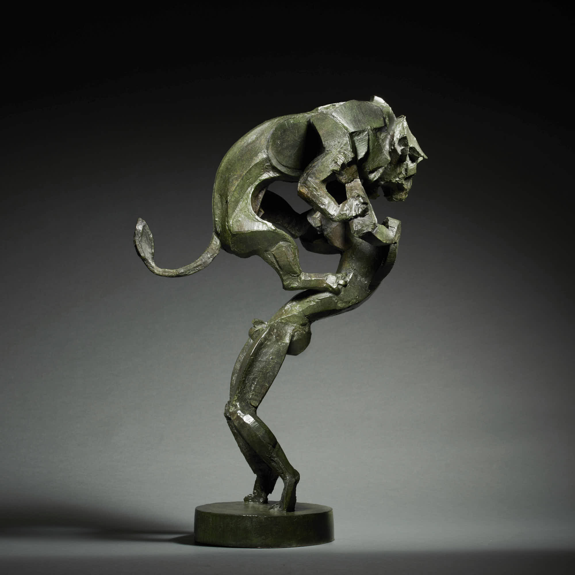Armed with a degree in the history of art from the Courtauld Institute, Sophie set out to learn the practicalities of making figurative sculpture, attending the Sir John Cass School of Art, and also the department of anatomy at University College, London.  Her distinctive style comes from her technique of building figures from abstract geometric shapes of curved wood and attaching them to an armature to create fluid, muscular form.