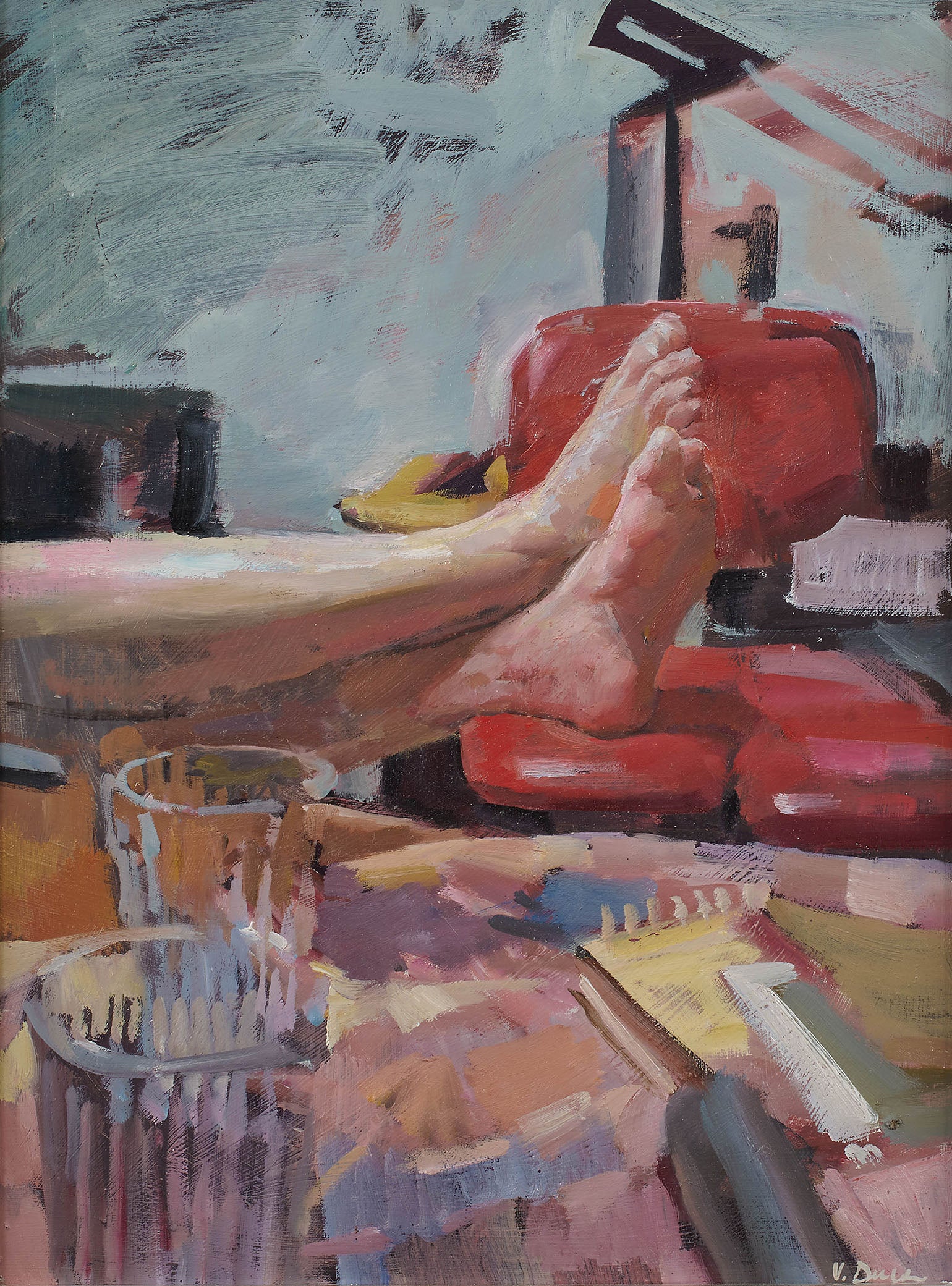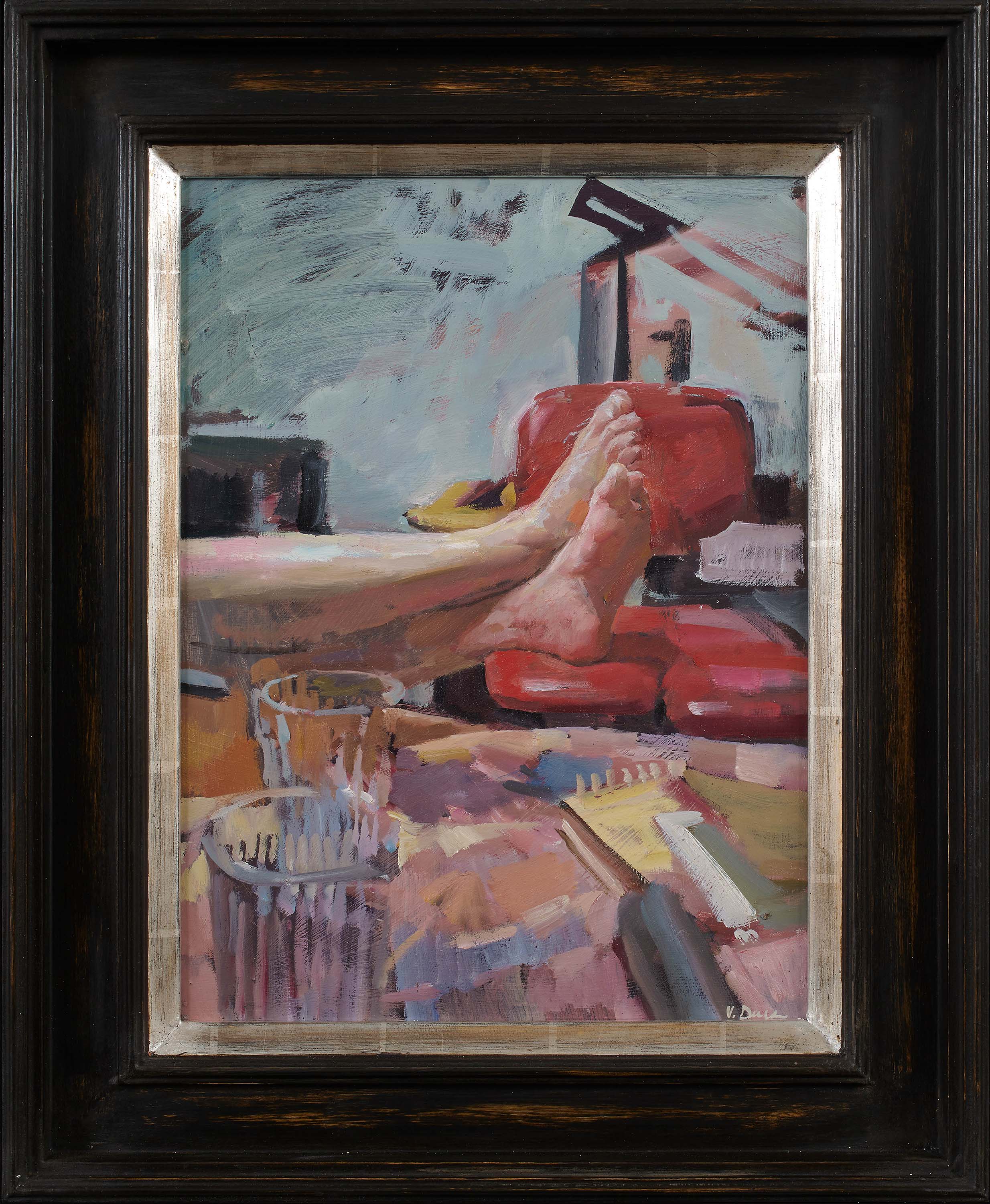 A young artist, Valeria is a rising star in the international figurative painting scene. Her works define the human condition through edgy, technically superb and often humorous self-portraits. Her recent collection of paintings is a deeply relatable account of one young woman’s frustrations during our lockdown global house arrest. A narrative depicting, if not a descent into madness, then at least a blurring of the edges of normality, at times flirting with the surreal.