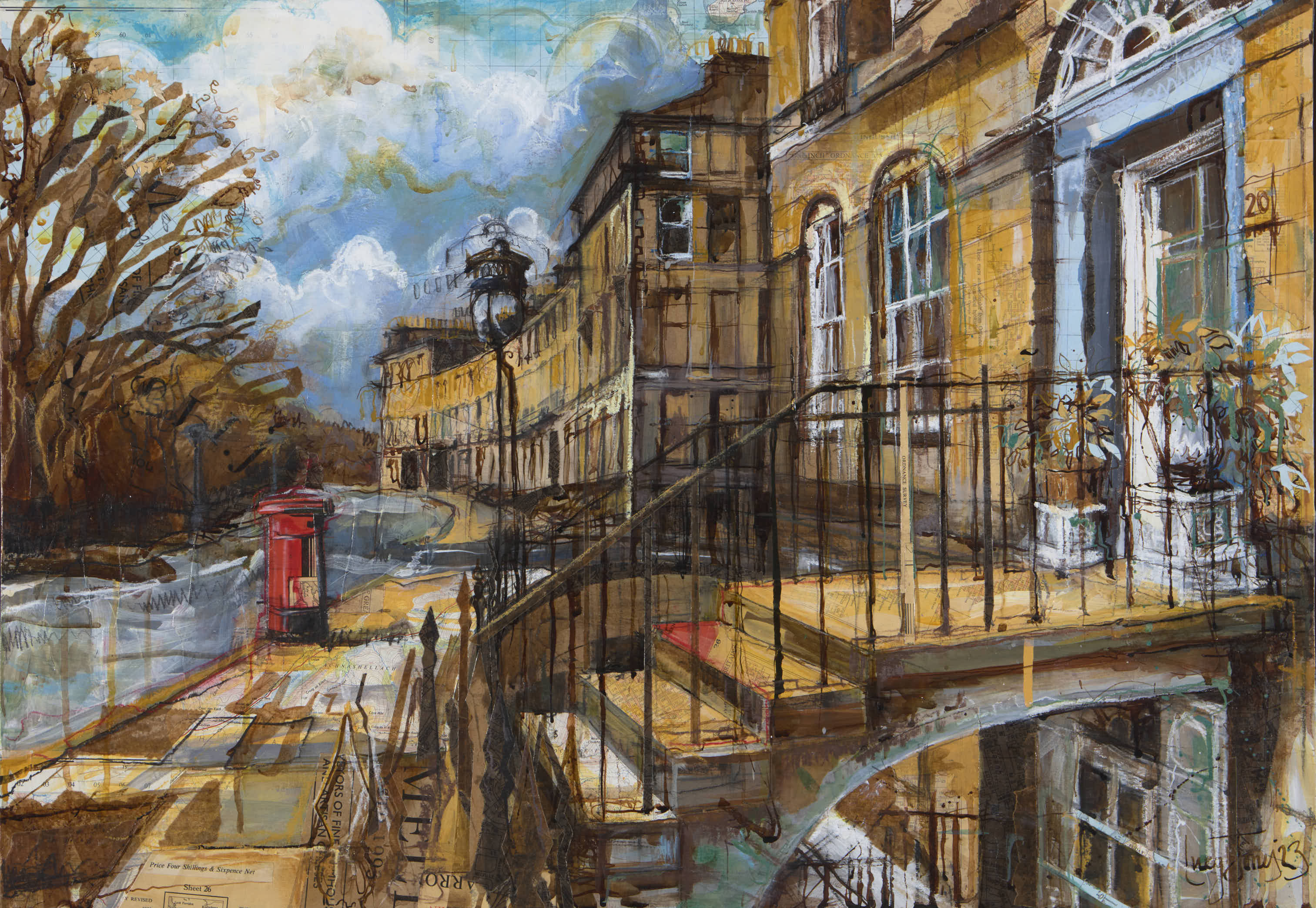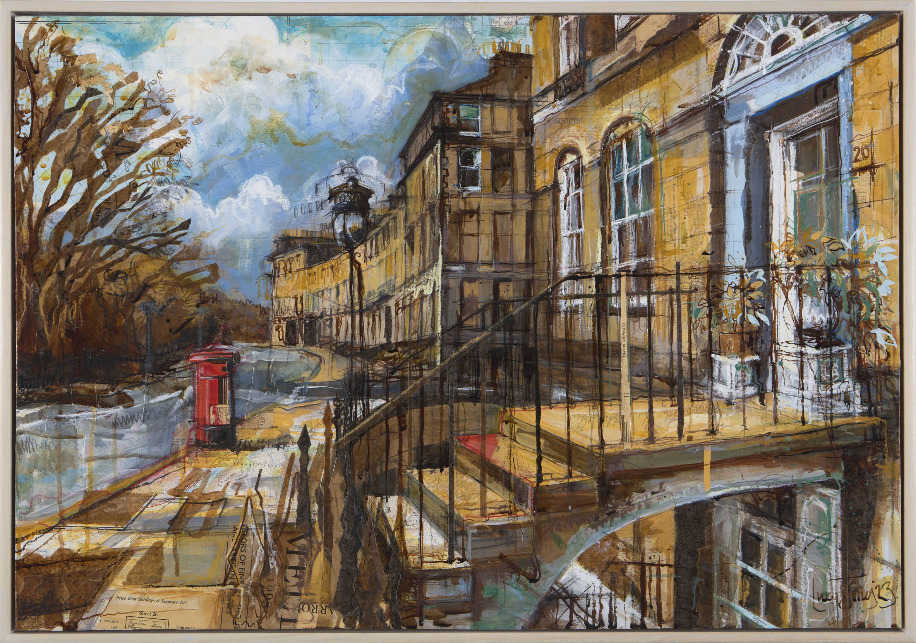 Having worked in the Edinburgh New Town for the past ten years, Lucy’s work has been inspired by the surrounding Georgian Architecture. She uses a distinctive combination of materials including collage, paint, print making, drawing and hot wax, to reconstruct distinctively ‘Edinburgh’ architectural features. A collector of old documents, maps and books, wherever possible, she constructs her collages with relevant texts and images, creating unique ‘building portraits’, which have a literary as well as visual story.