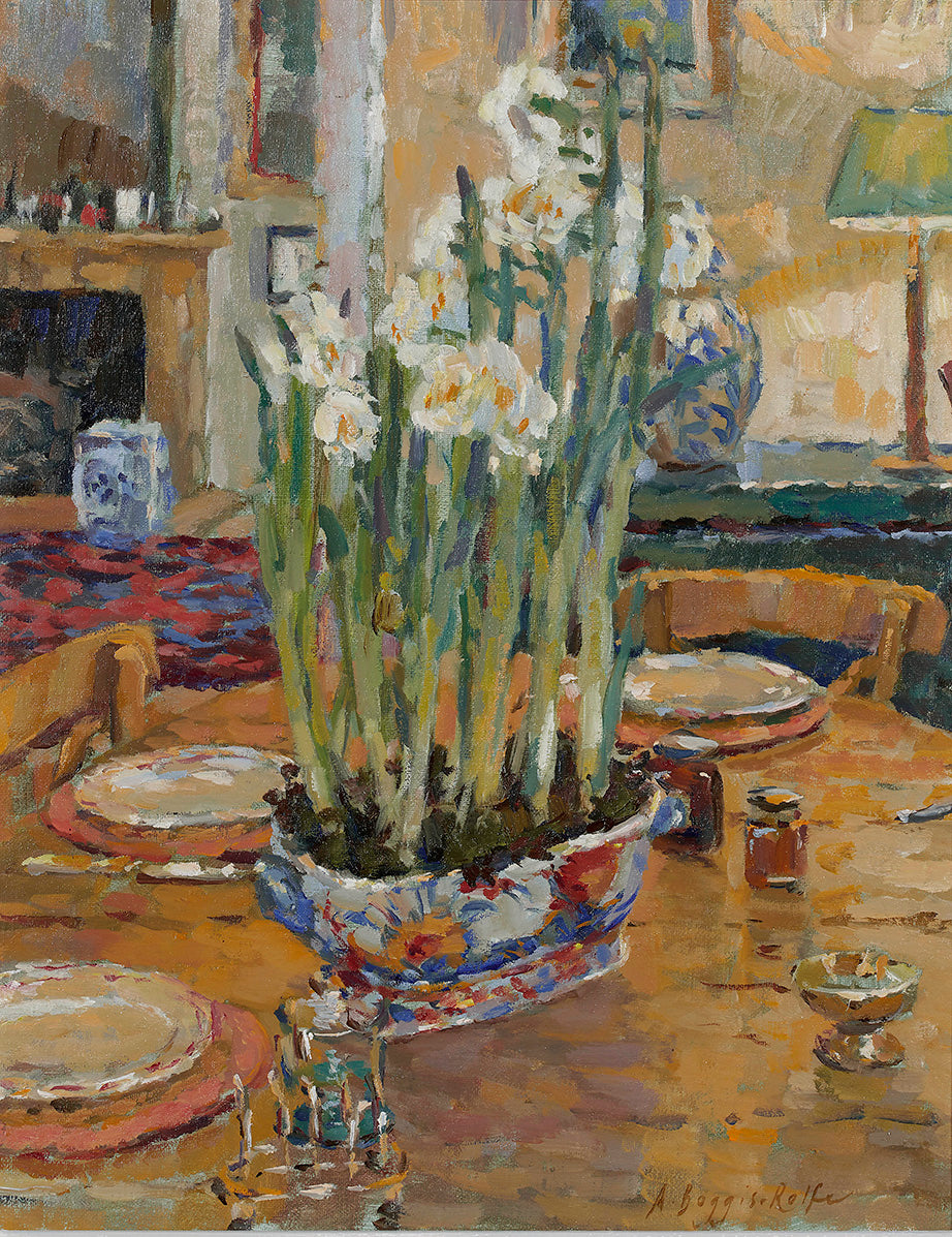 Born in 1990, Alice Boggis-Rolfe is a figurative painter. Her subject matter veers from vast open landscapes to quiet, intimate interiors and still-lifes. She spent her twenties travelling the world with her paints, holding exhibitions back in London between trips. Her practice has since evolved into carefully constructed studio work using a broad palette, interspersed with bouts of the plein air painting she still adores.