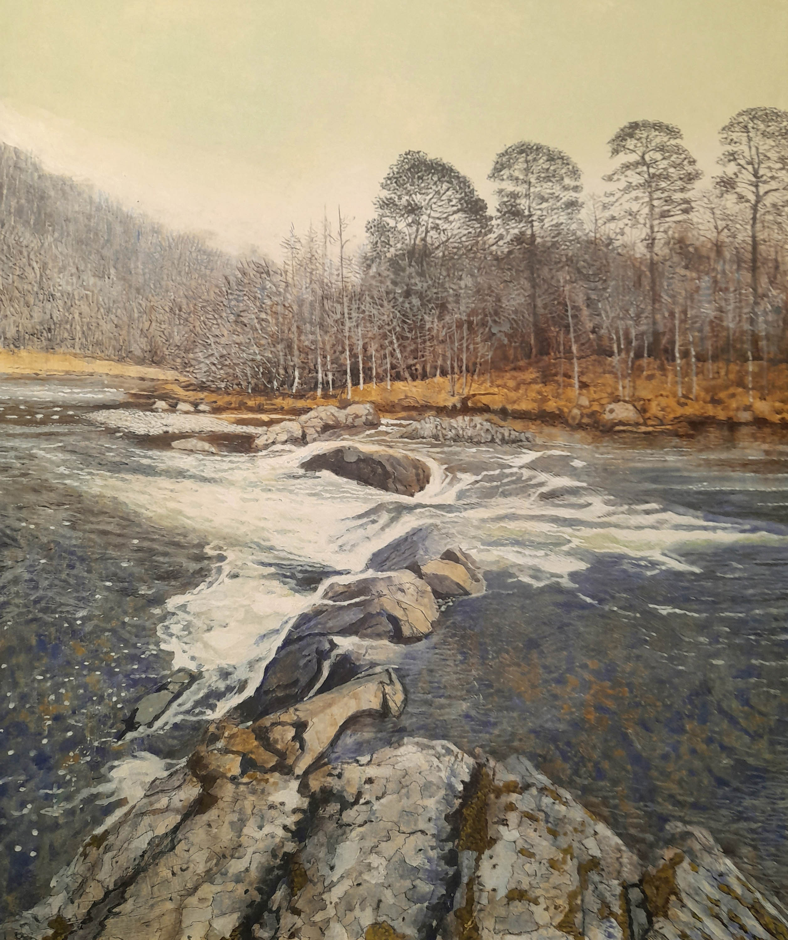 Andrew seeks the sublime in a landscape; many are rugged and windswept. The uncomfortable feeling of standing too close to a cliff edge, or the barren quality of a hillside moor, give the paintings an exciting visual edge. (Geoffrey Bertram, 2010)
