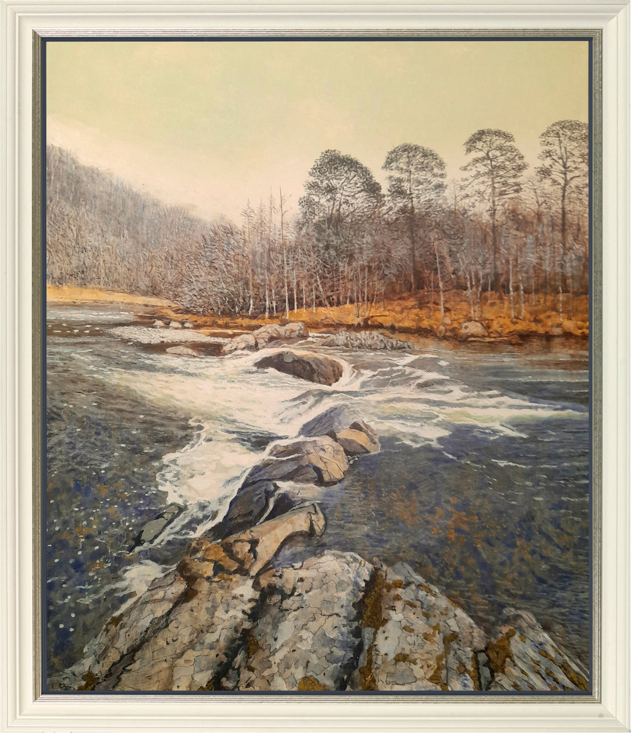 Andrew George is one such artist adept in using this medium. He paints the landscapes around his home in the Mendip hills of North Somerset, Dorset’s Coastline and the hills of Scotland. On first impression his paintings are finely detailed – they are incredibly well observed, often with each blade of grass given perfect realisation; and yet on closer inspection one notices passages of paint which are almost abstract, where the detail is more impressionistically suggested. Multiple perspectives lead the eye to a combination of vanishing points that provide a wonderful sense of space and distance.