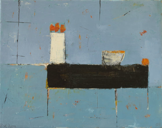 The paintings are predominantly oil on linen or board and I prefer a limited palette, mixing my colours from the three primaries, black and white.  I start by making random marks of colour (the under painting is integral to the work) which gradually take shape as pared down Still Life compositions, hopefully bringing order, balance and a bit of tension into the initial chaos. My fascination with the relationship between form, space, and colour is fundamental to my practice.
