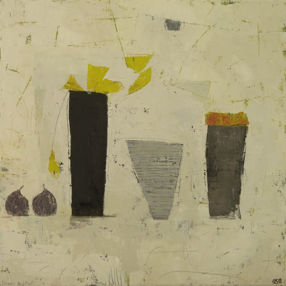 The paintings are predominantly oil on linen or board and I prefer a limited palette, mixing my colours from the three primaries, black and white.  I start by making random marks of colour (the under painting is integral to the work) which gradually take shape as pared down Still Life compositions, hopefully bringing order, balance and a bit of tension into the initial chaos. My fascination with the relationship between form, space, and colour is fundamental to my practice.