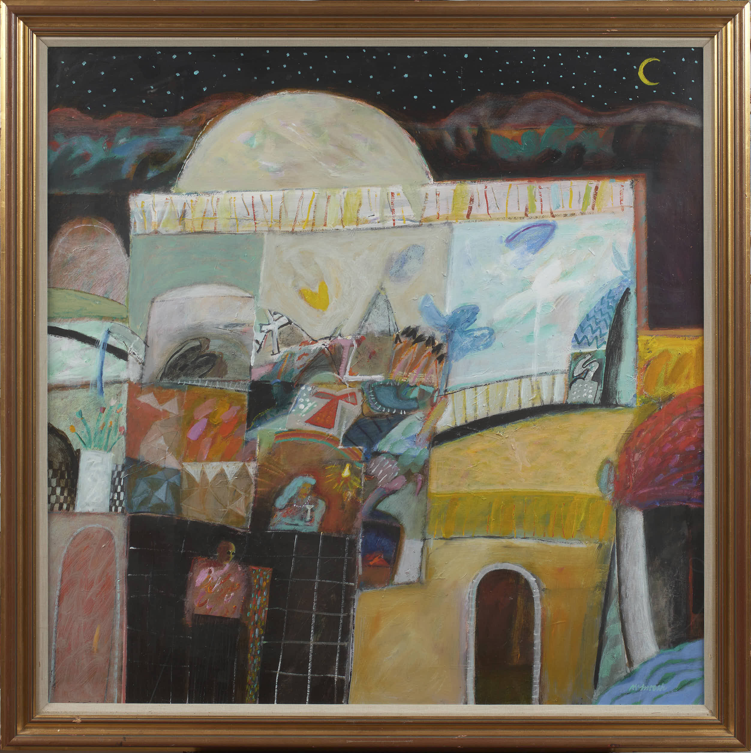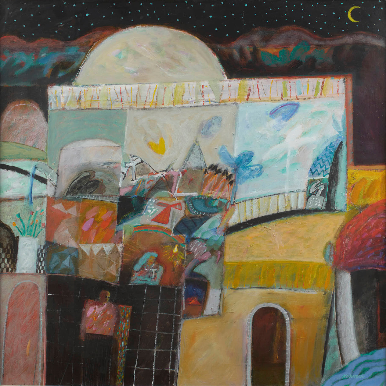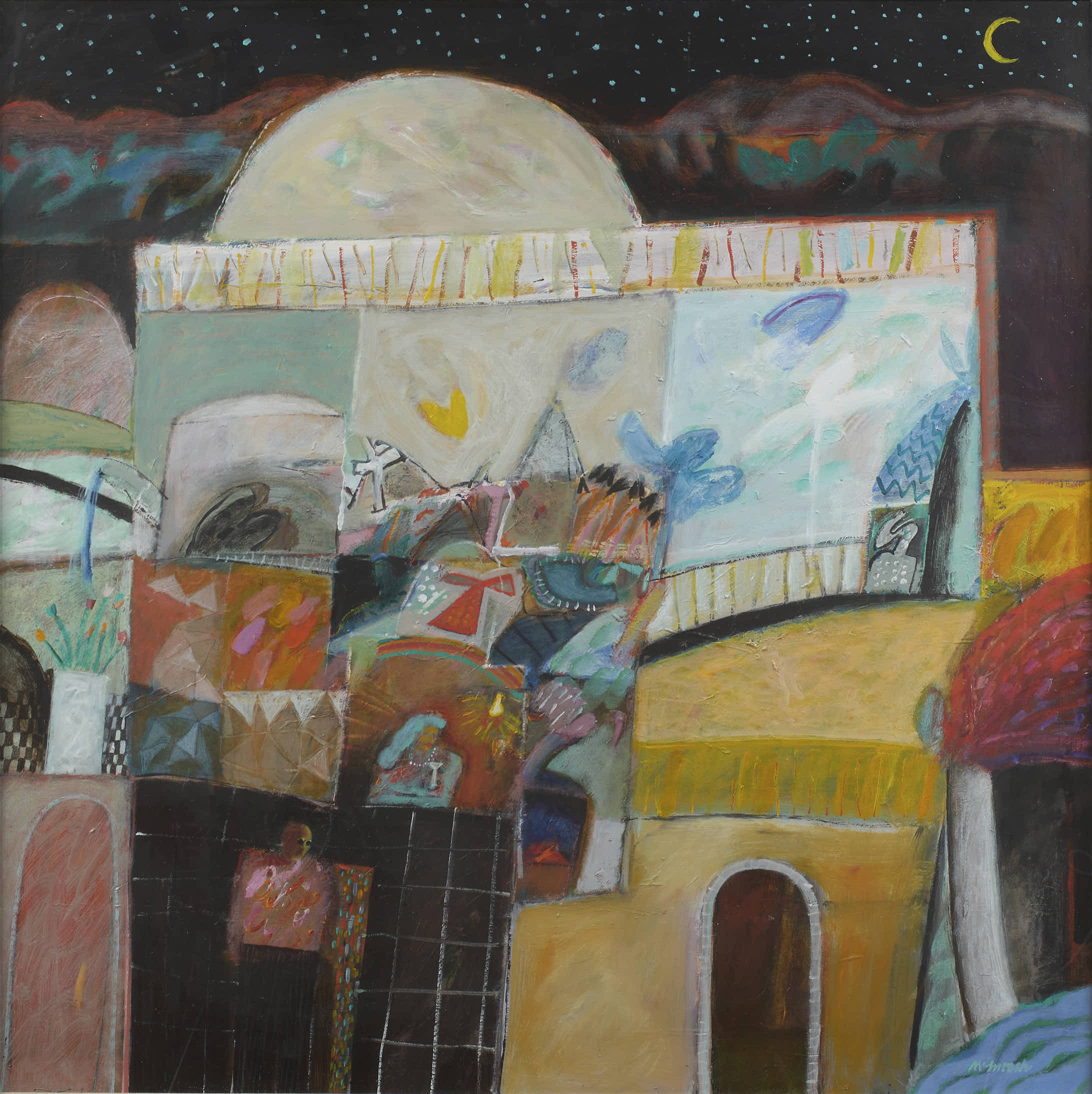 In the last decade Archie has perfected a mature style, a semi-abstracted depiction of several themes closest to his heart. He has drawn on his childhood memories of the Clyde marine industry, the lochs and landscapes of his youth and the tiny fishing villages along the East Neuk of Fife near his Dunfermline home. He is perhaps best known for his paintings of the latter, carefully arranged designs of geometric shapes interspersed with recognizable motifs - creels, numbers, ropes and sections of stone wall - rendering the essence of a working quayside. The night sky is an important theme in Archie’s work that he often returns to. Musing on the immensity of the starlit heavens he sees the concept of the infinite as a useful reminder of our own immortality, and a timely perspective on life and our place within it.