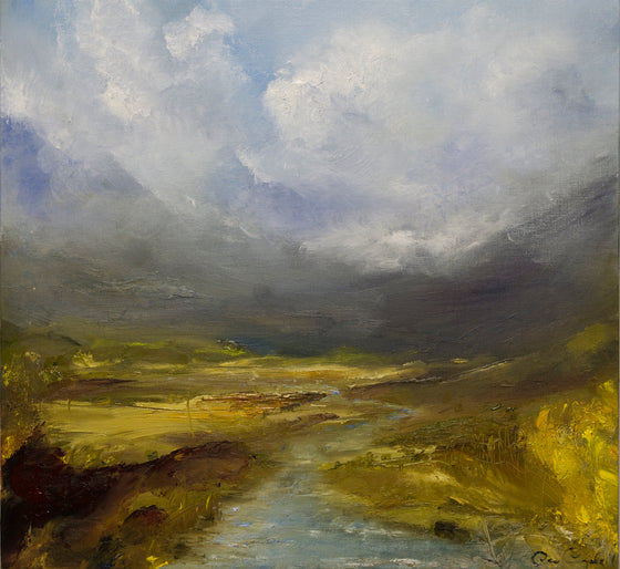 "Living in the Yorkshire Dales for the last four years and experiencing their dramatic ancient landscapes of Coverdale, Swaledale, Wensleydale and Richmondshire have brought new, thought provoking, ideas into my paintings. During these years I have painted the seasonal drama in this often remote countryside: depicting the turning of the wild purple heather clad moors during the middle of August, the extraordinary abundance of summer wild flowers, the first poppies and the inescapable harsh blizzards of winter snow.