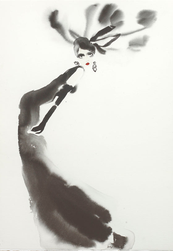 “I love to paint elegant women, in beautiful clothes, in glamorous settings. I’m not really inspired by fashion per se, as more by the feel of the fashion from the past; the Forties and Fifties in particular have a classic, ageless beauty expressed by fashions of the time. I am influenced enormously by the elegant and beautiful fashion drawings by illustrators of this period, as well as contemporary fashion artists and illustrators working today. I love the playful, flirty and romantic story telling in the work of illustrators such as Rene Gruau and Andre-Edouard Marty to name but a few.”