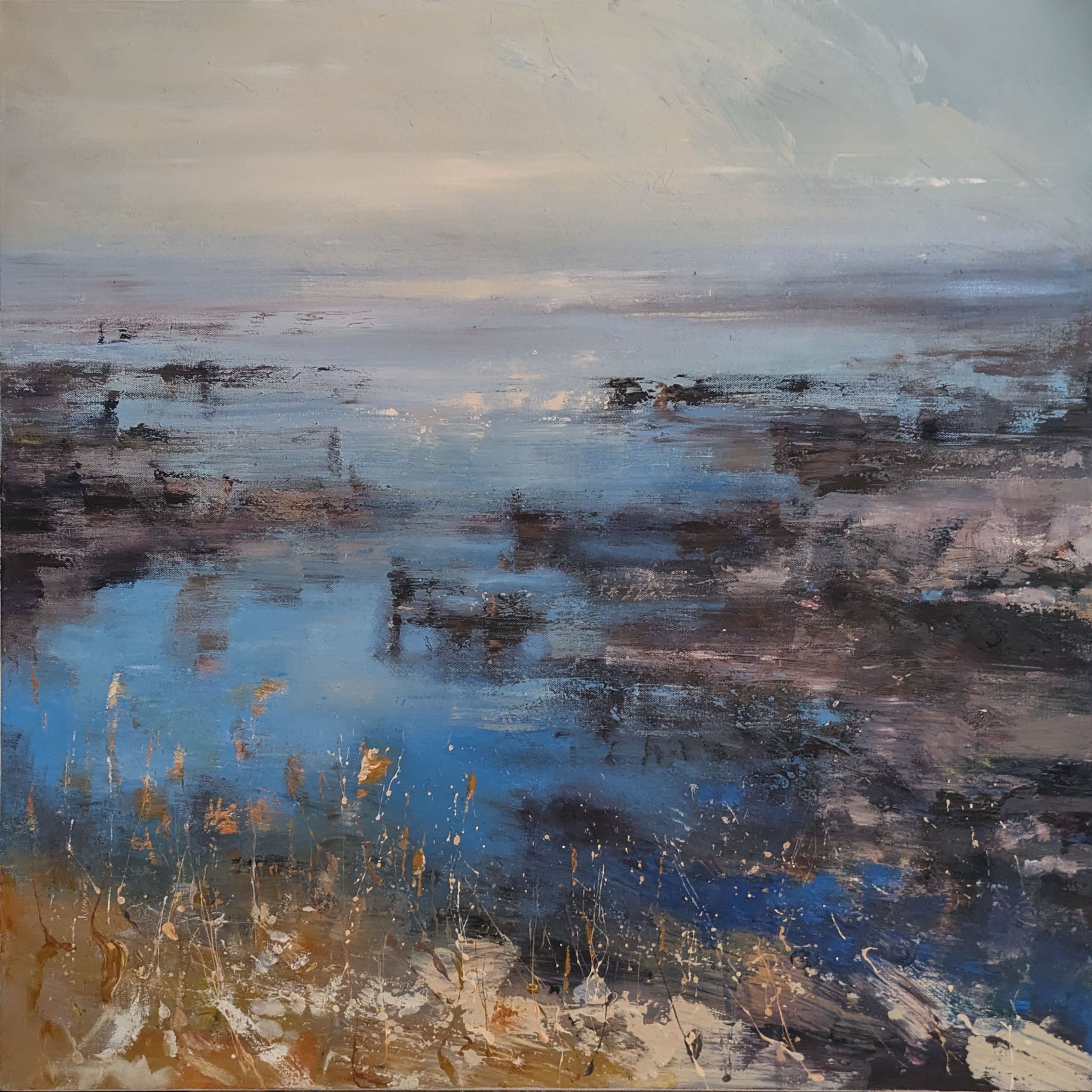 Claire’s oil and mixed media canvases combine layers of paint with fragments of collage. She scratches through sections of the painting to allow colours from underneath to emerge. “I want to create evocative paintings of land and sea that show a sense of place; different weather conditions are key elements”. Claire uses brushes and different size palette knives to build up layers and create depth. Paint is also flicked or carefully thrown on selected areas, evidence of this can be found all over her studio floor!  . Claire's work has ambiguous elements as she believes that “total recognition inhibits the imagination” however, at the same time, she works with strong structural compositions more often than not using a square format which she feels is important in creating a balance and harmony in her paintings.  Inspiration comes from the outdoors, walking and travelling, and poems often accompany Claire's work to help communicate specific ideas.