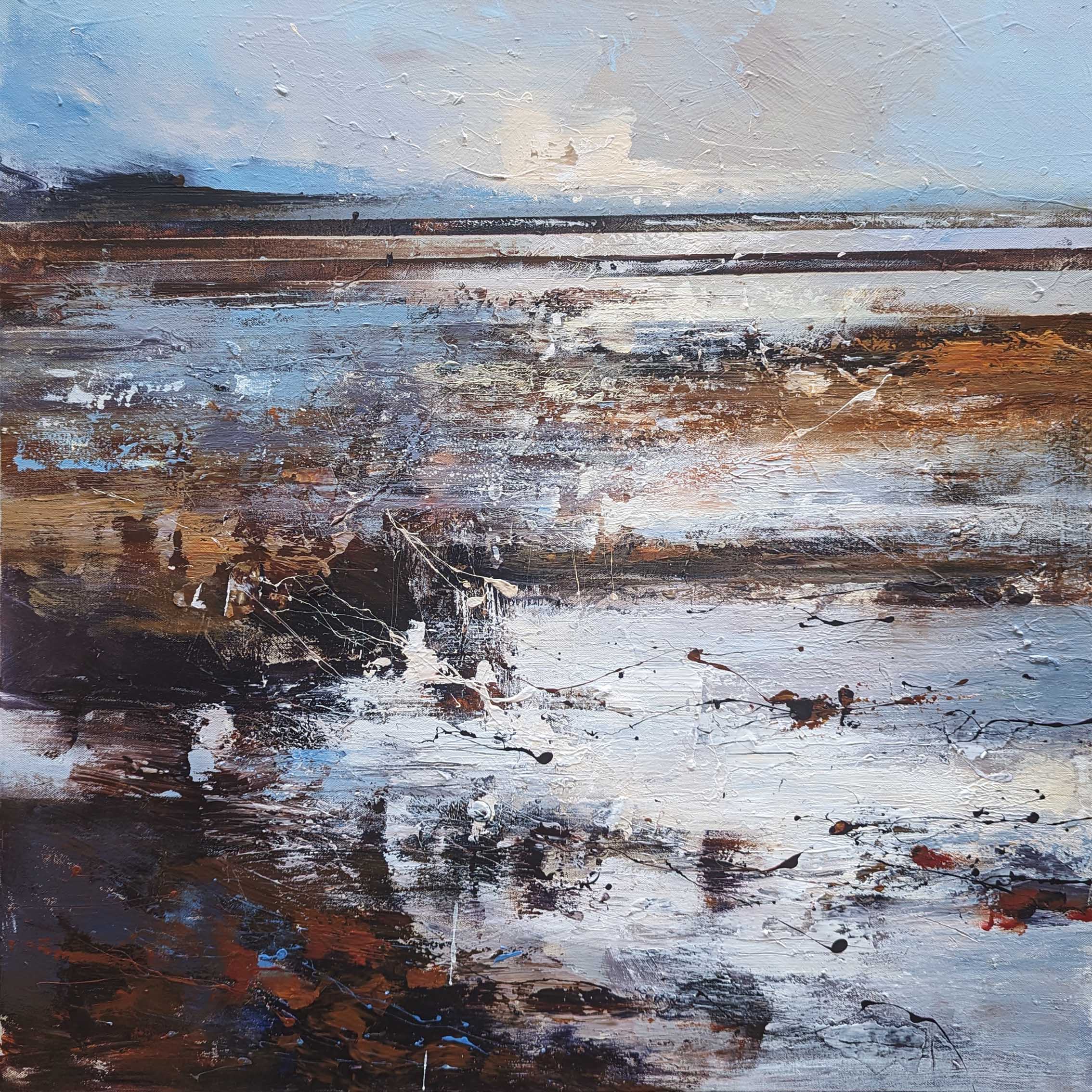 Claire’s oil and mixed media canvases combine layers of paint with fragments of collage. She scratches through sections of the painting to allow colours from underneath to emerge. “I want to create evocative paintings of land and sea that show a sense of place; different weather conditions are key elements”. Claire uses brushes and different size palette knives to build up layers and create depth. Paint is also flicked or carefully thrown on selected areas, evidence of this can be found all over her studio floor!  . Claire's work has ambiguous elements as she believes that “total recognition inhibits the imagination” however, at the same time, she works with strong structural compositions more often than not using a square format which she feels is important in creating a balance and harmony in her paintings.  Inspiration comes from the outdoors, walking and travelling, and poems often accompany Claire's work to help communicate specific ideas.