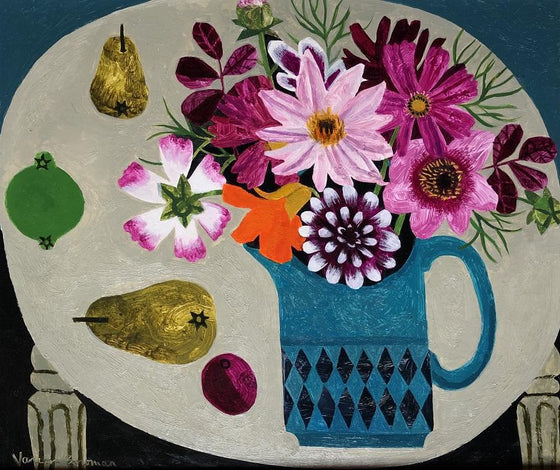 Each of Vanessa’s still lifes observes the simple beauty of everyday objects - a moment captured in time. A vase of garden flowers, a bowl of lemons (their acid yellow placed against the deep magenta plum), a striped shell - each is placed deliberately within the framework of the painting combining muted subtle colour with jewel-like accents.
