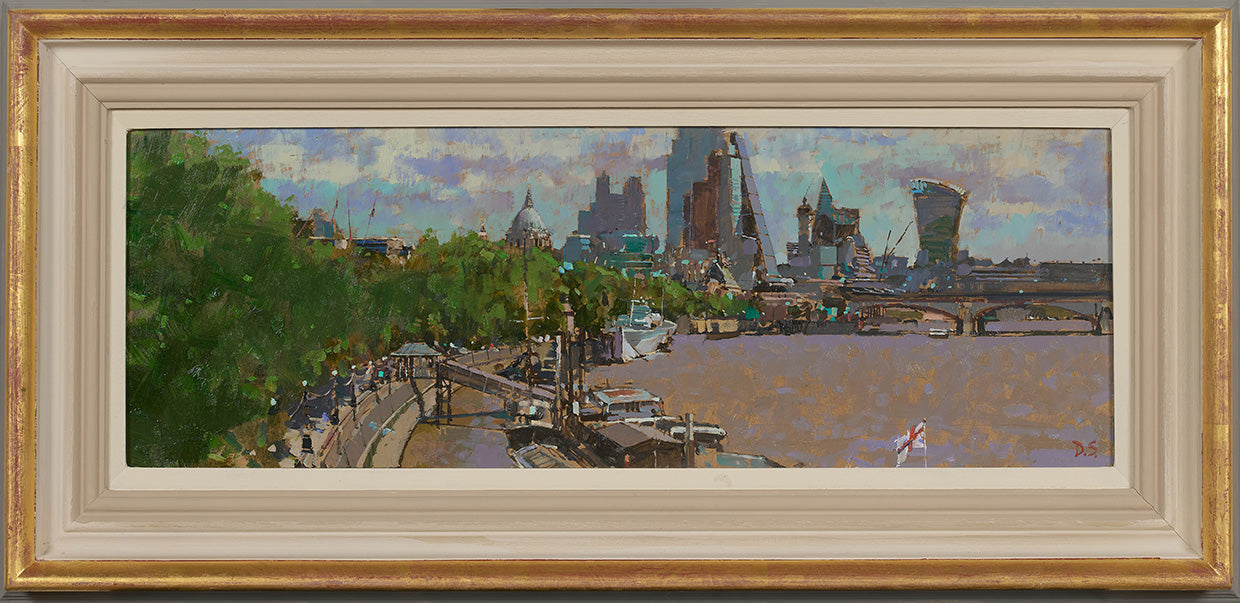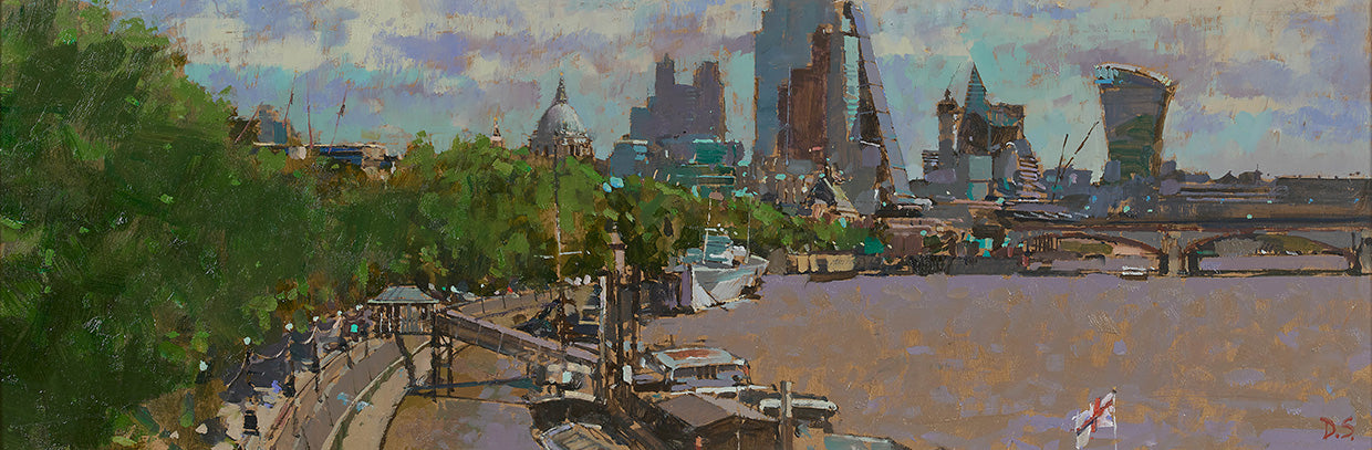 Born in London, David graduated from Canterbury College of Art in the early 1980s. Since then, he has worked continually as a fine artist including a brief period as a scene painter. He has held numerous solo exhibitions in private galleries and exhibited widely with public institutions, notably the New English Art Club, The Royal Society of British Artists, The Royal Institute of Painters in Watercolour, and the Chelsea Art Society. He has won many prizes at the societies’ annual shows and is an elected member of both the Royal Society of British Artists and the Chelsea Art Society. Past commissions include a series of London views for a City boardroom in the Fried Frank building and paintings for the State Rooms of Cunard’s new Queen Mary II.