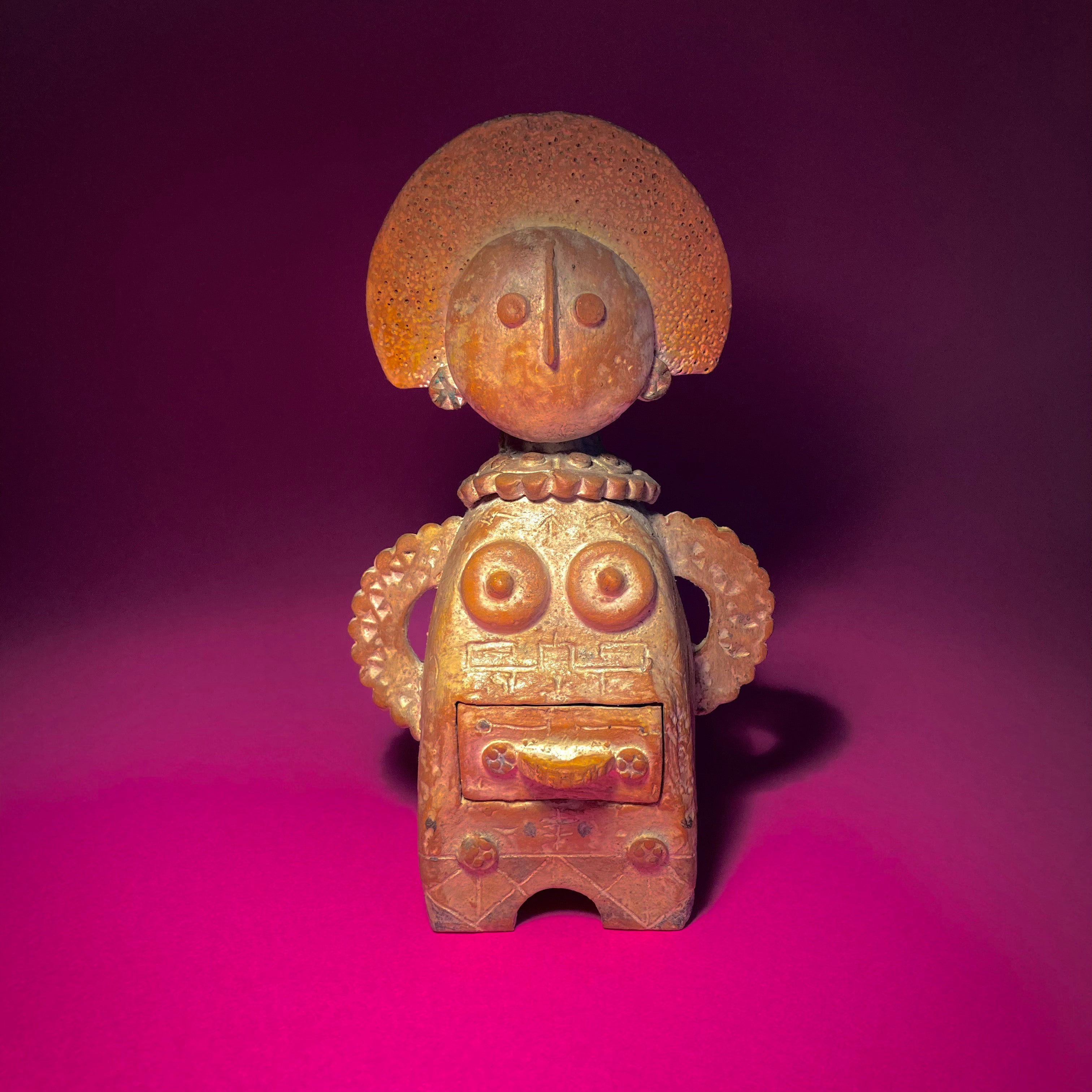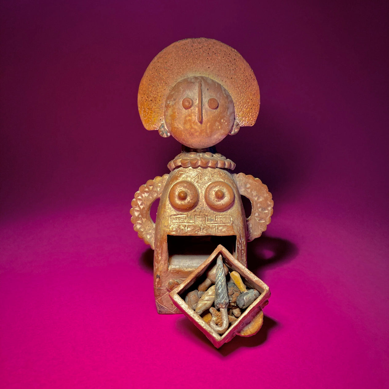 Inspired by an interest in folk art, religious and tribal art along and a good dash of whimsy he allows other influences, including the physical nature of the clay and his background in illustration to enter the creative mix.