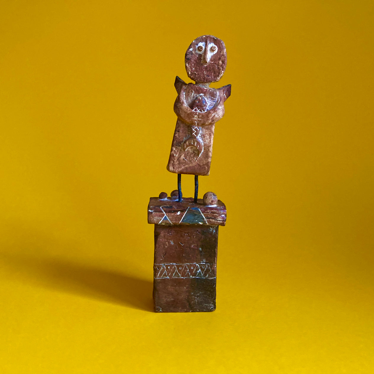 Inspired by an interest in folk art, religious and tribal art along and a good dash of whimsy he allows other influences, including the physical nature of the clay and his background in illustration to enter the creative mix.