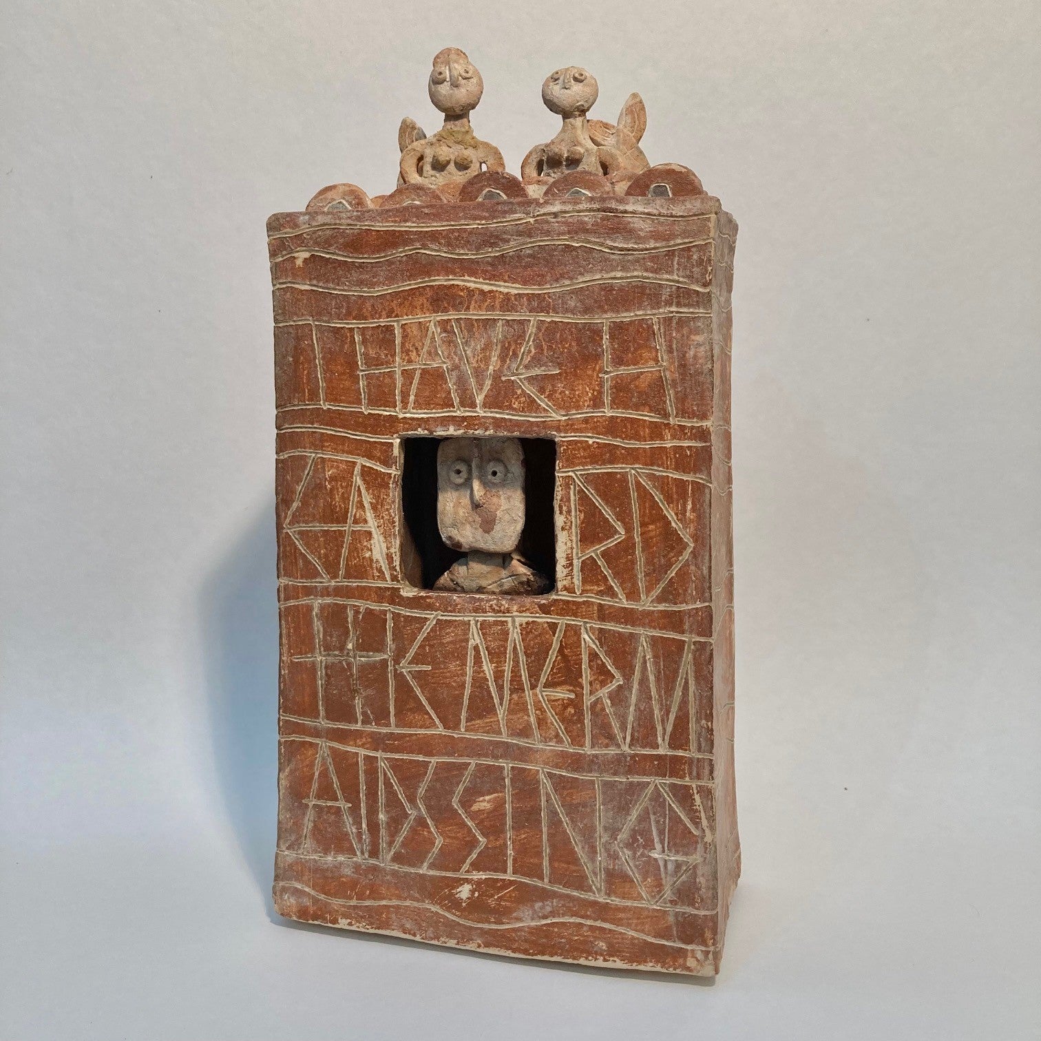 Inspired by an interest in folk art, religious and tribal art along and a good dash of whimsy he allows other influences, including the physical nature of the clay and his background in illustration to enter the creative mix.