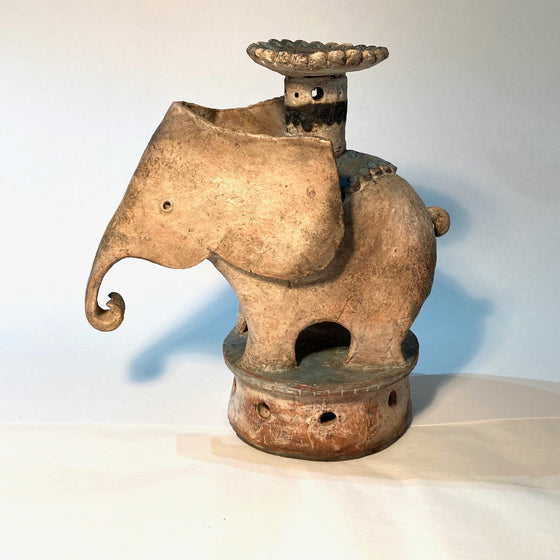 It took me a while to develop the method but my elephants are made from two “sheets” of clay gently encouraged into shape. I make an elephant and then add features as the piece takes on shape and character. This particular work is somewhere between a “salt” and a candle stick in design with a hint of vintage circus act.