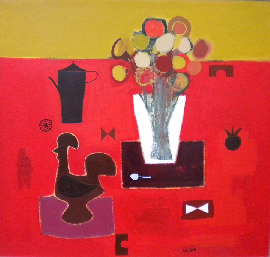 Simon’s paintings are typically inspired by everyday objects and the ever-changing Scottish landscape; they have been said to combine the purity and formalism of the St Ives School with the rich tradition of the Scottish Colourists. On first encounter they appear light hearted and joyous, both in their vibrant palette and choice of everyday items placed in jaunty juxtaposition.  As with many painters of similar stature the rich decorative quality of each work belies a greater complexity.  Simon is a very serious painter and his current approach is the culmination of several decades at his craft. Originally an abstract constructionist he produced monochromatic three-dimensional works before developing a more colourful series of found object boxed sculptures in the 1980s and 1990s. Since then he has returned to the flat surface, to paint and collage, to refine the ideas he had explored to the full in the constructions. These paintings are the culmination of that distillation process, the reduction of reality to simple form and colour.