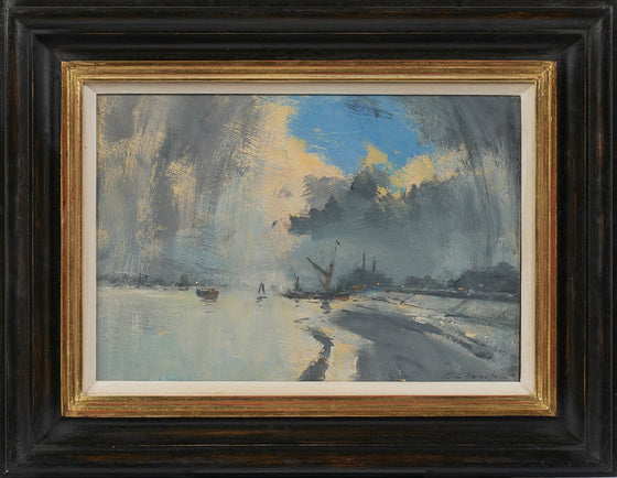 In 1964 he moved to North Walsham in Norfolk with his wife and family, where he taught music at the town high school. With Seago as an artistic godfather it was natural to gravitate to the county that had made the great man’s name and whose distinctive ‘flat’ landscapes inspired centuries of artists to subordinate land and man to its towering skies. Solo shows soon followed in Lincoln and Norwich, the latter with Mandell’s in 1970, shortly before Seago’s death. The success of the Norfolk exhibition allowed him to buy the sea-going Thames Spritsail Barge “Raybel” in which he subsequently gained his Master’s Certificate. Apart from the pure pleasure in sailing it, the Raybel allowed him to immerse himself in the weather off shore around East Anglia. Particularly sea weather and traditional sail in action, adding an enormous authenticity of experience and knowledge to the depiction of his subjects that so many of his followers now lack.
