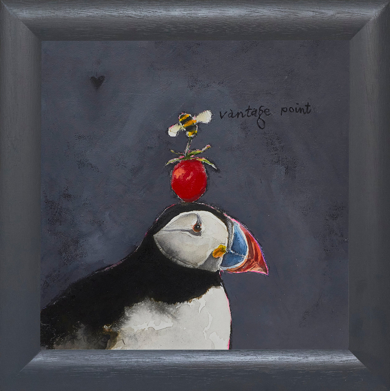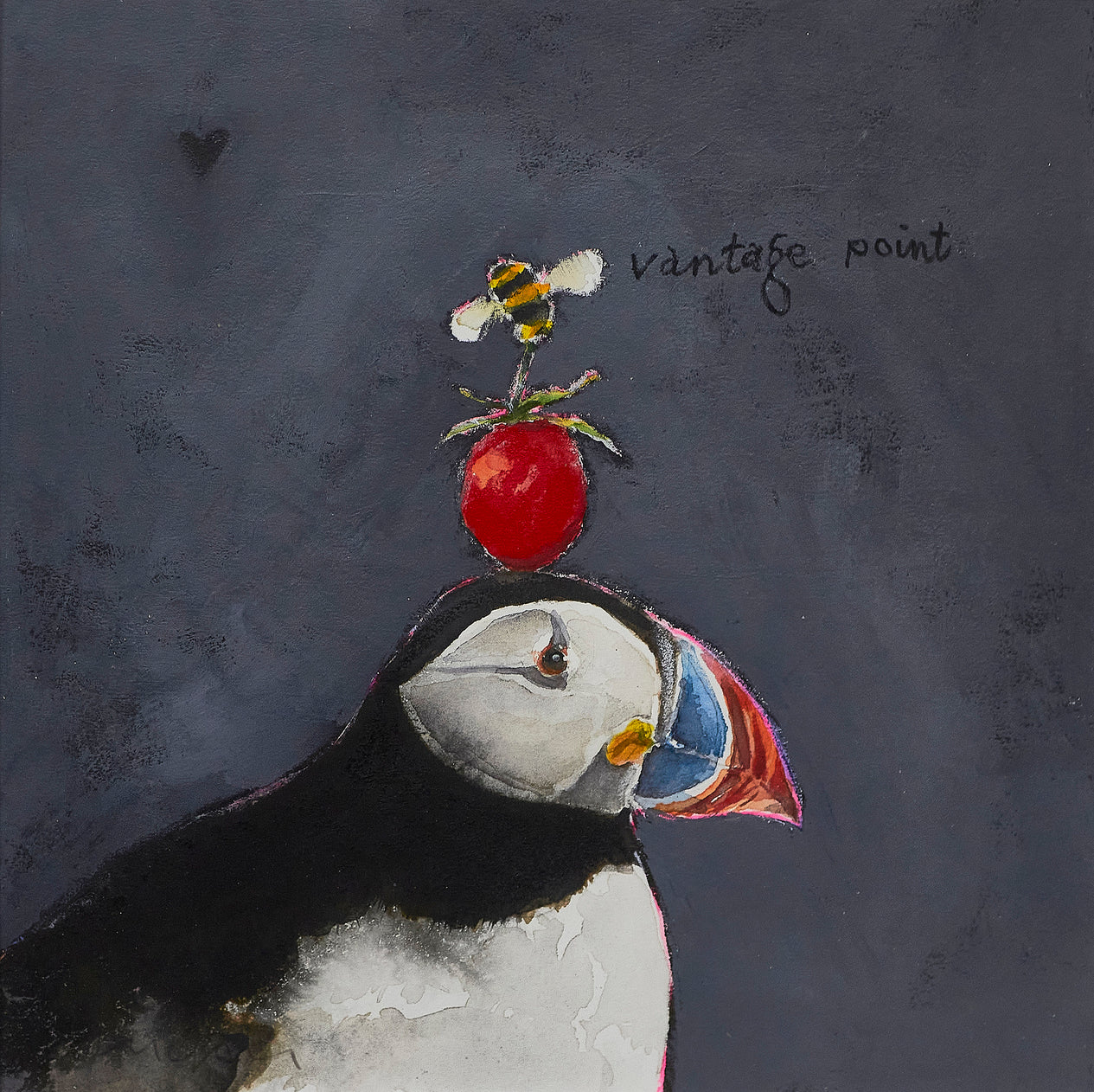 "I tend to choose my subject (usually animal) for their decorative quality which can be explored through the medium of watercolour and collage. I don't normally know what the finished painting is going to look like, I don't plan or do any preliminary sketches, I suppose it is a bit hit or miss! I like to start with one object then add as necessary, sometimes there is a link but normally there isn't. The unlikely collections of objects in my work makes people think, making up their own links. I love to hear how differently my work is interpreted. My paintings are often described as 'quirky' which I like, as life is all too often a bit of a downer, so I enjoy creating daft paintings which can make people a wee bit cheerier!"