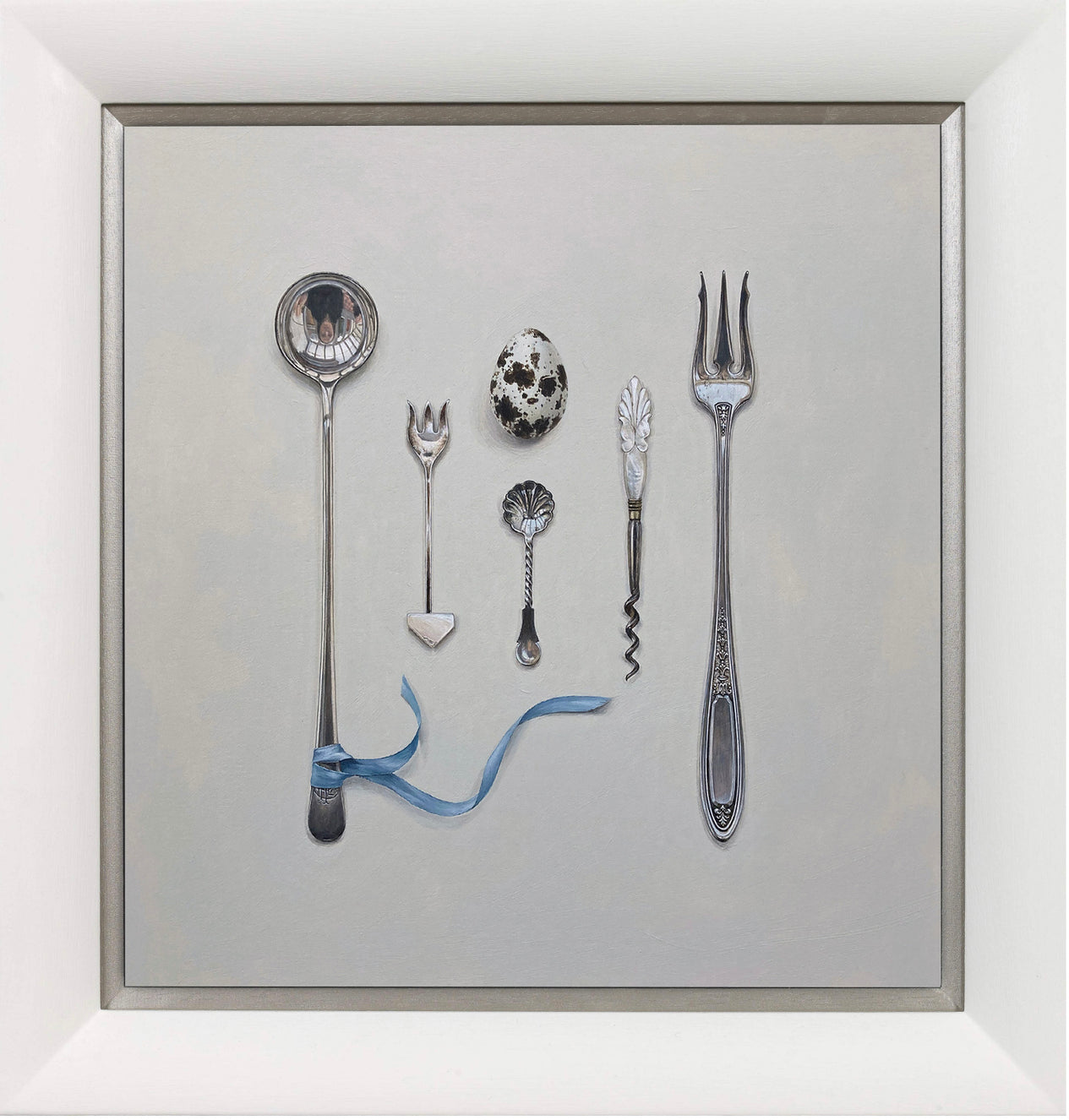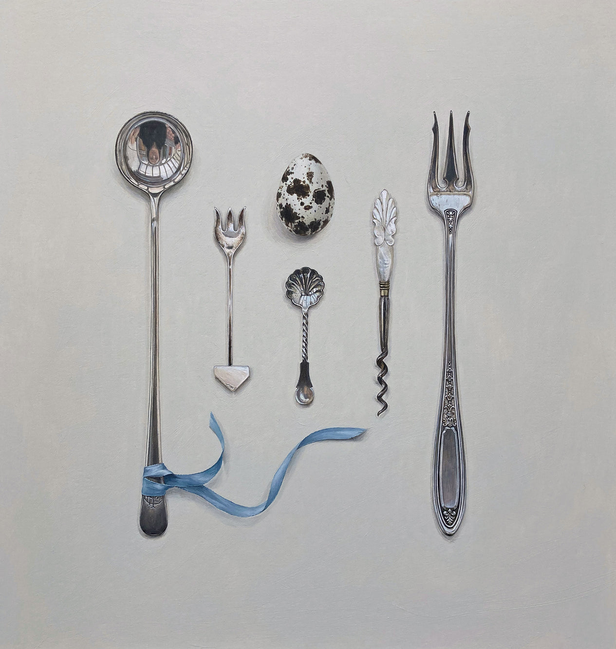 Arranged Silverware with Quail’s Egg and Blue Ribbon