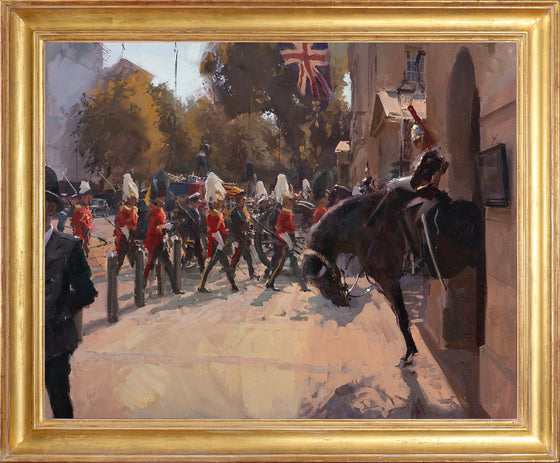 Based in South Cheshire, Rob travels widely in search of inspiration and can often be spotted painting in the streets of our major cities. His commissions have taken him all over the world; a residency with Manchester Airport saw him outside Beijing painting on the Great Wall of China. His reputation for capturing live formal occasions was key to his residency with the Household Cavalry Mounted Regiment, but has also led him to record the Royal Gala Dinner to celebrate the conservation of the Painted Hall at the Old Royal Naval College, Greenwich. HRH The Prince of Wales unveiled a 24 foot oil painting by Rob in the Council Chamber, Stoke-on-Trent, commissioned to commemorate 100 years of the federation of the six towns.