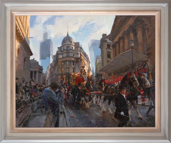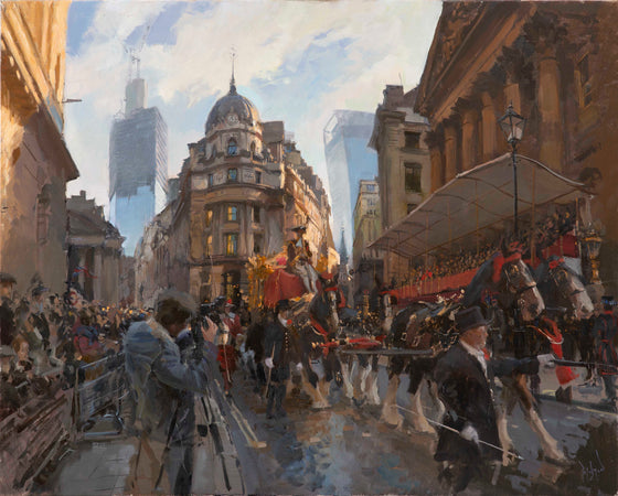 Based in South Cheshire, Rob travels widely in search of inspiration and can often be spotted painting in the streets of our major cities. His commissions have taken him all over the world; a residency with Manchester Airport saw him outside Beijing painting on the Great Wall of China. His reputation for capturing live formal occasions was key to his residency with the Household Cavalry Mounted Regiment, but has also led him to record the Royal Gala Dinner to celebrate the conservation of the Painted Hall at the Old Royal Naval College, Greenwich. HRH The Prince of Wales unveiled a 24 foot oil painting by Rob in the Council Chamber, Stoke-on-Trent, commissioned to commemorate 100 years of the federation of the six towns.