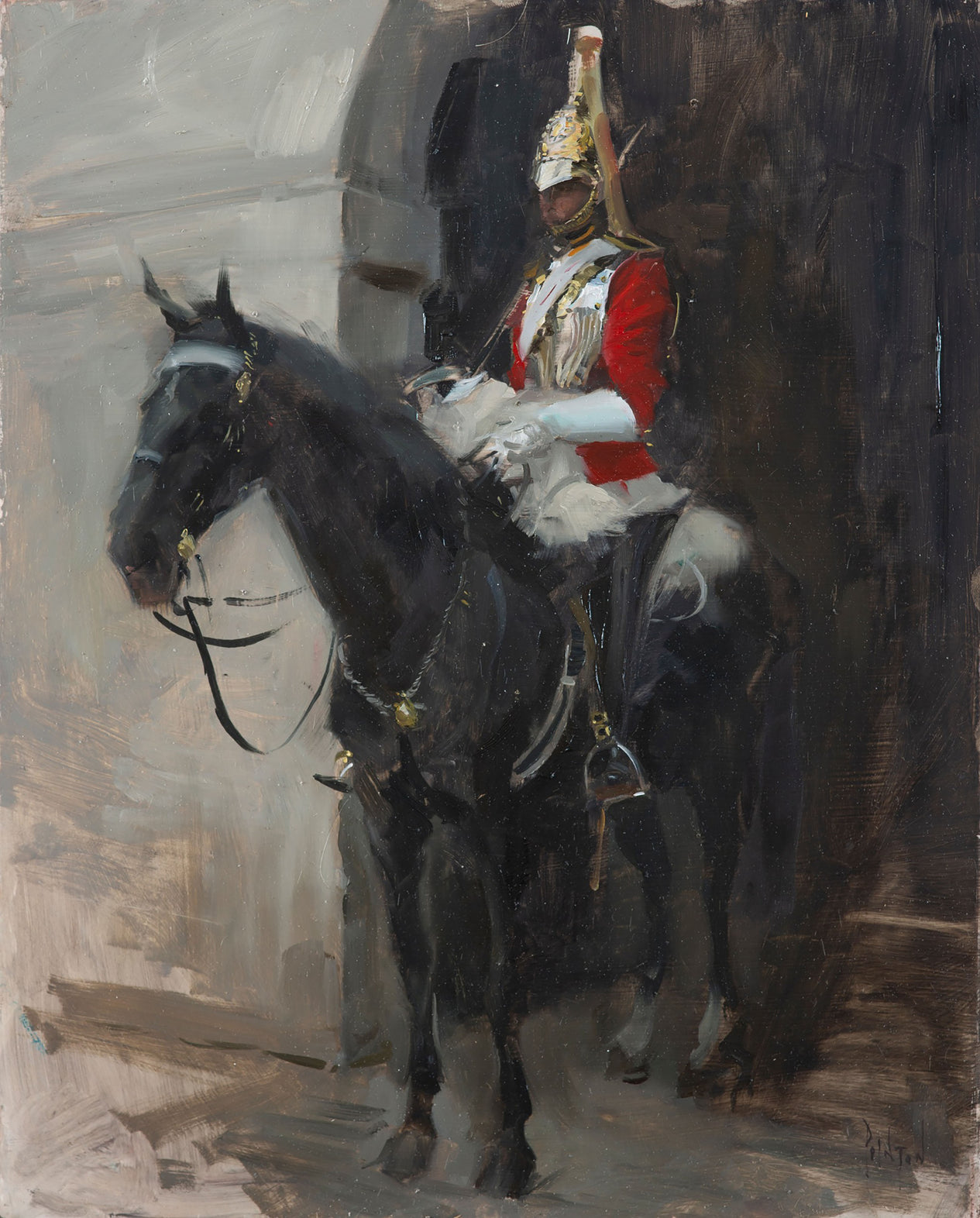 Based in South Cheshire, Rob travels widely in search of inspiration and can often be spotted painting in the streets of our major cities. His commissions have taken him all over the world; a residency with Manchester Airport saw him outside Beijing painting on the Great Wall of China. His reputation for capturing live formal occasions was key to his residency with the Household Cavalry Mounted Regiment, but has also led him to record the Royal Gala Dinner to celebrate the conservation of the Painted Hall at the Old Royal Naval College, Greenwich. HRH The Prince of Wales unveiled a 24 foot oil painting by Rob in the Council Chamber, Stoke-on-Trent, commissioned to commemorate 100 years of the federation of the six towns.