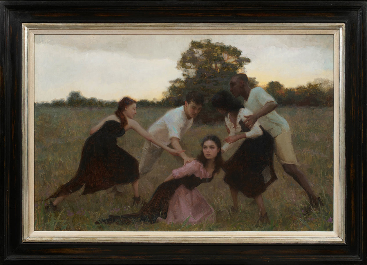 Ruth’s work is almost always figurative; it is humanity, facial expression, and body language which spark her imagination. She is celebrated for her empathetic characterisations, and for the strong narrative element she brings to her paintings. Inspirations include the work of pre-Raphaelite and naturalist painters (Waterhouse, Bastien-LePage, Friant).