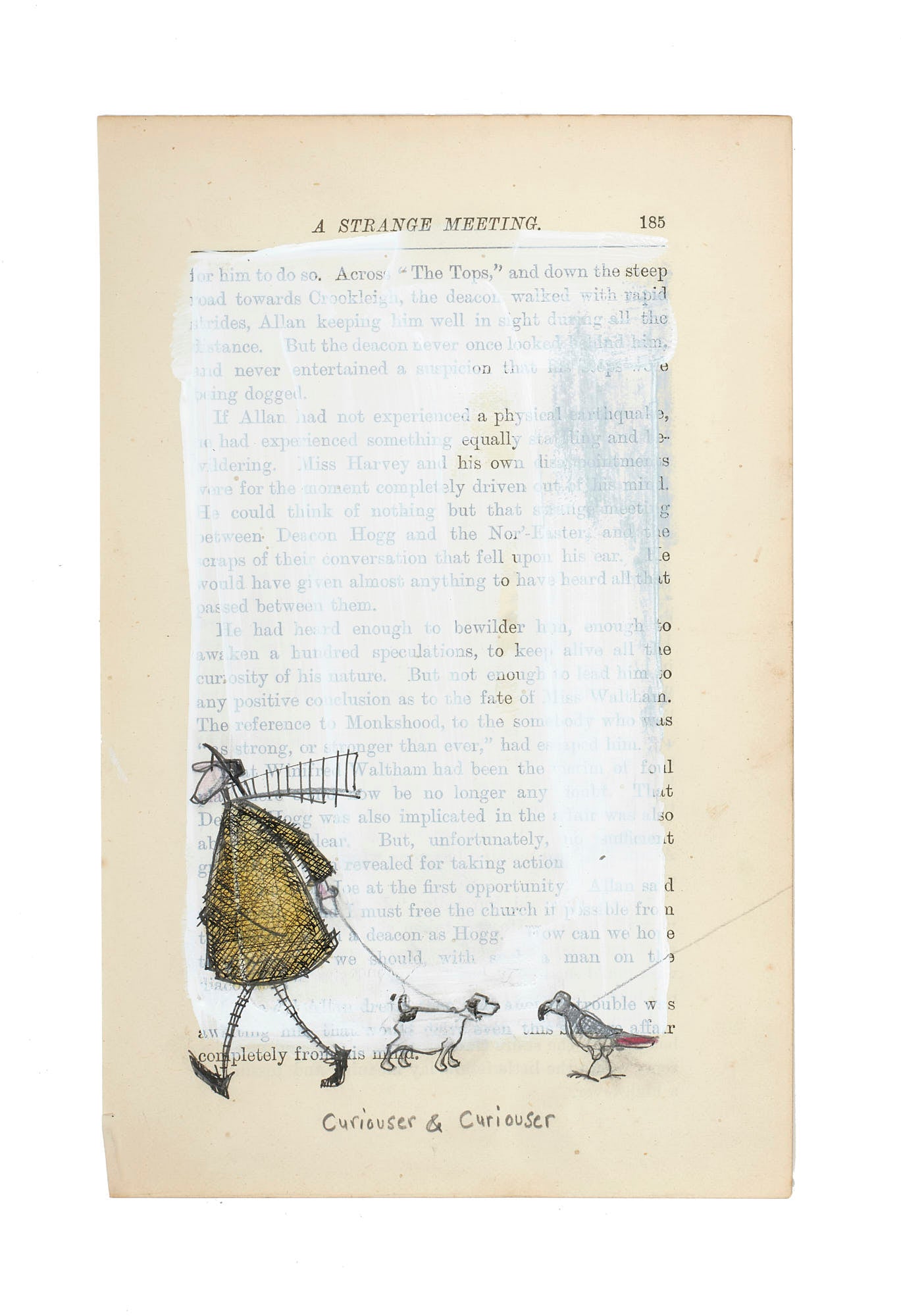 Acrylic, coloured pencil, and ink hatching on vintage book pages & UV protective museum glass