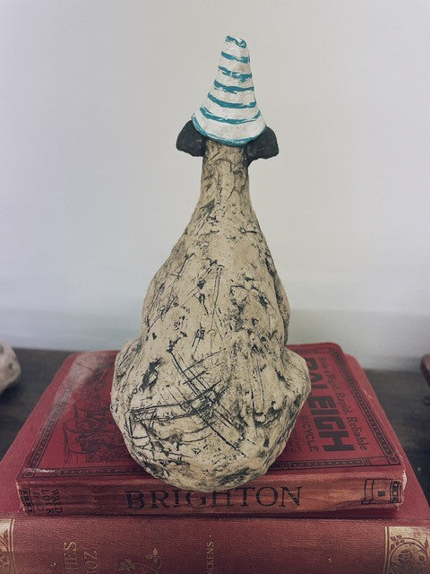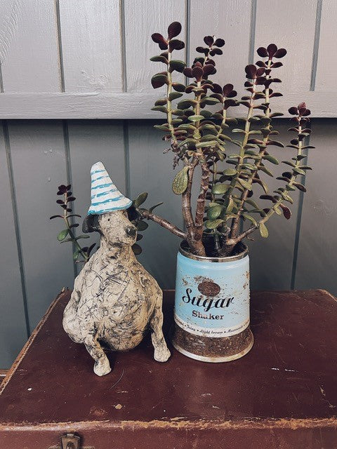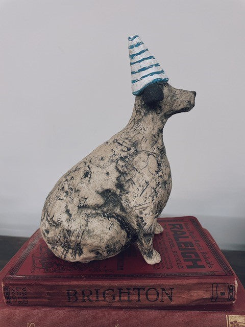 Hand-built hollow earthenware dog finished with sgraffito and underglazes for a hand painted feel; approx 6 inch tall.