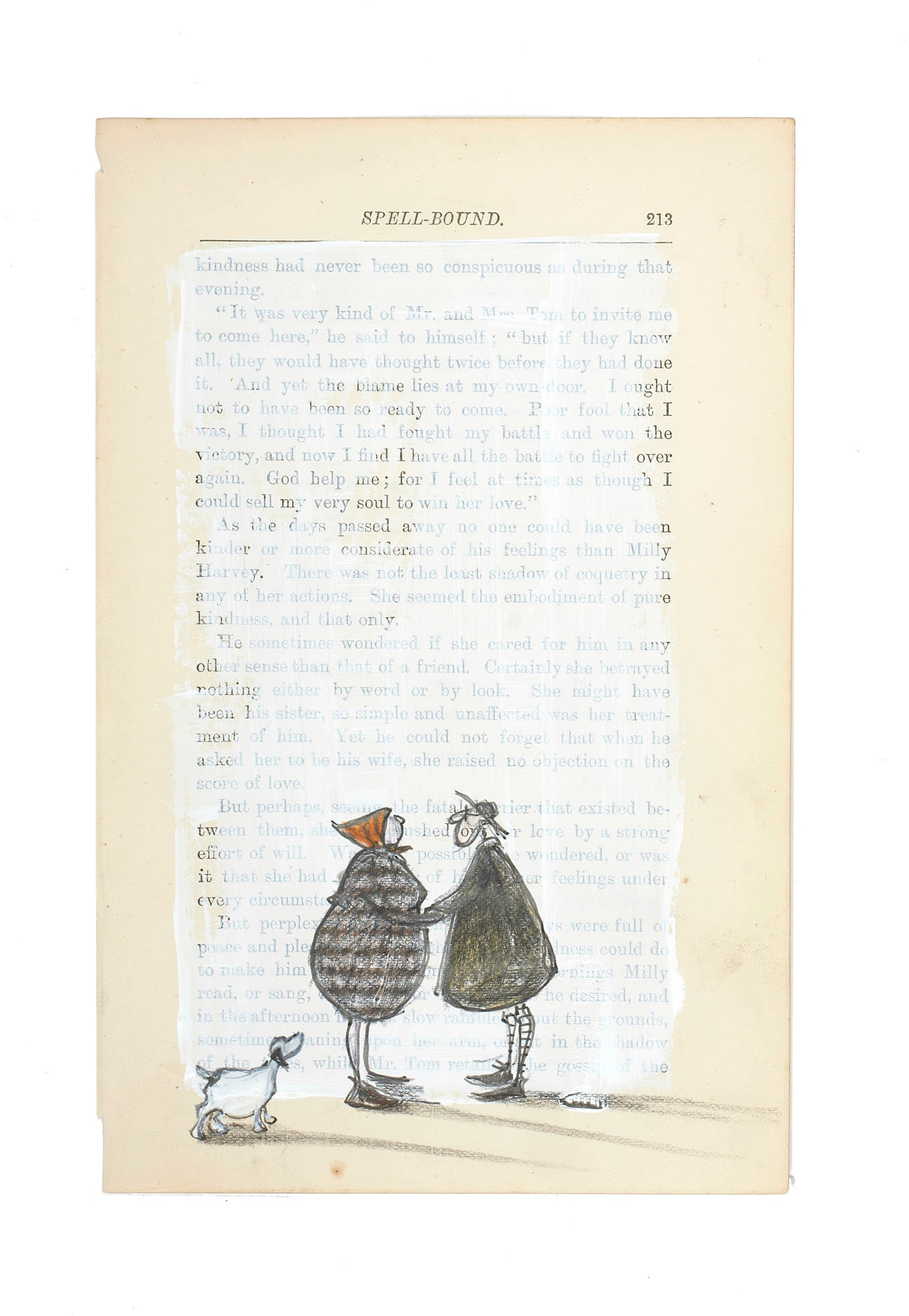 Acrylic, coloured pencil, and ink hatching on vintage book pages & UV protective museum glass