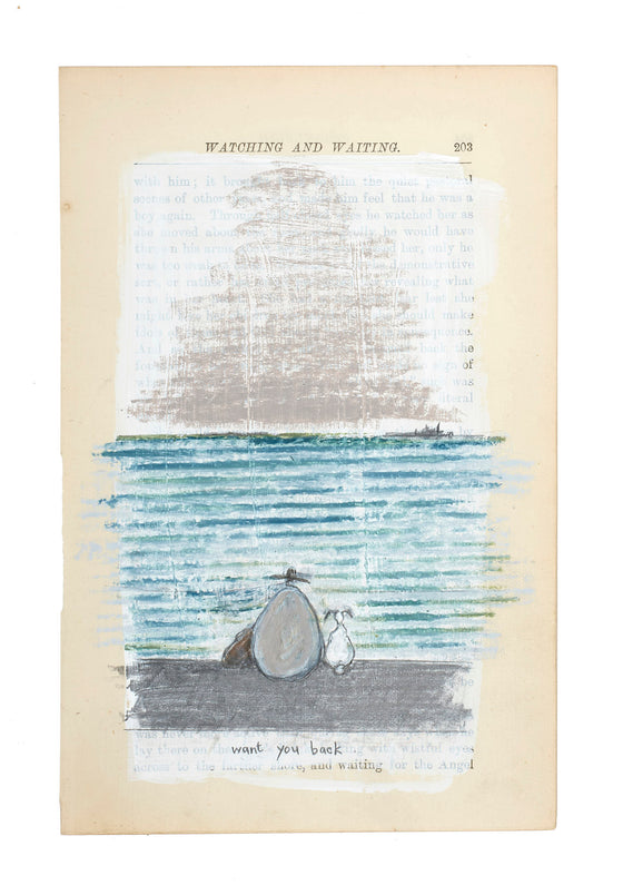 Acrylic, coloured pencil, and ink hatching on vintage book pages & UV protective museum glass