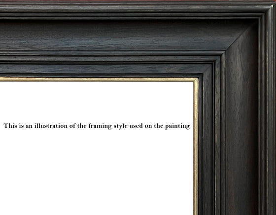 Wide, dark stained solid wood frames, waxed and lightly distressed by hand, gold fillet & UV protective museum glass